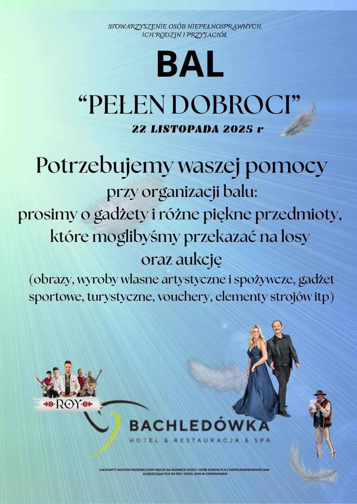 Serdecznie zapraszamy na coroczny Bal Charytatywny Stowarzyszenia Osób Niepełnosprawnych ich Rodzin i Przyjaciół które już od lat wspiera uczniów niepełnosprawnych z naszych szkół w Czerwiennem. Podczas balu przewidziane są liczne atrakcje oraz loterie z których dochód zostanie przekazany na działanie Środowiskowego Domu Samopomocy w Czerwiennem, będącego ważnym miejscem rozwoju niepełnosprawnych podopiecznych, którzy ukończyli już swoją edukację ale potrzebują przestrzeni do realizowania swoich pasji i odkrywania nowych możliwości. Ponadto SONiRiP wspiera ustawicznie działania podejmowane przez szkołę przyczyniając się bezpośrednio do podnoszenia efektywności pracy z uczniami niepełnosprawnymi i potrzebującymi szczególnego wsparcia. Ta szlachetna inicjatywa nie będzie jednak możliwa bez waszego wsparcia - udziału w balu i pomocy w jego organizacji. Dlatego zachęcamy do zapisów oraz wsparcia w postaci darów na licytację. Każda pomoc się liczy. Bądźcie z nami w tym ważnym wydarzeniu.