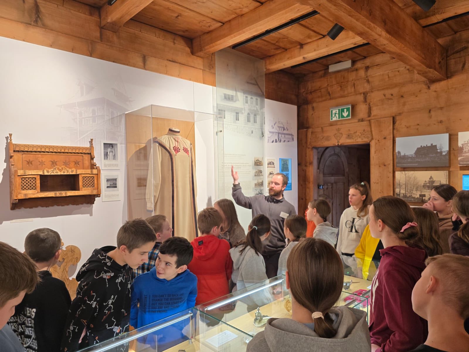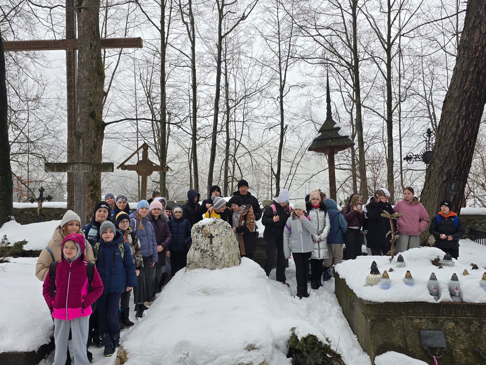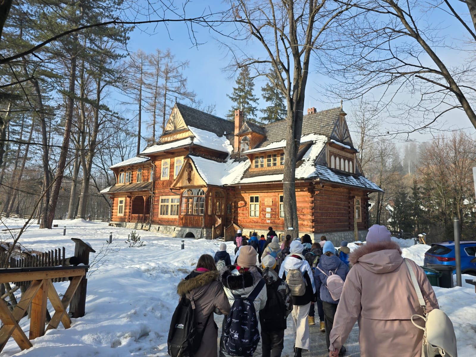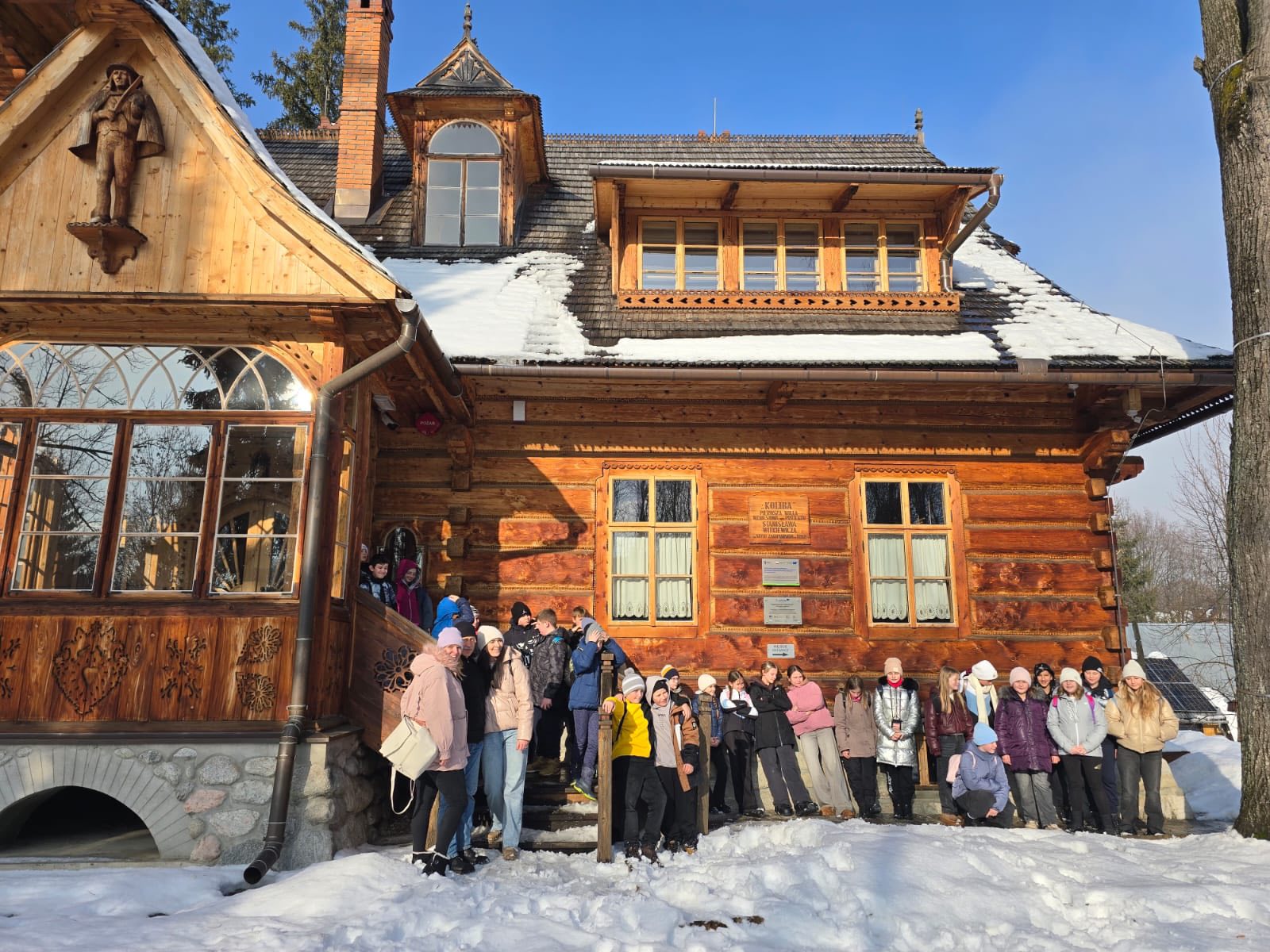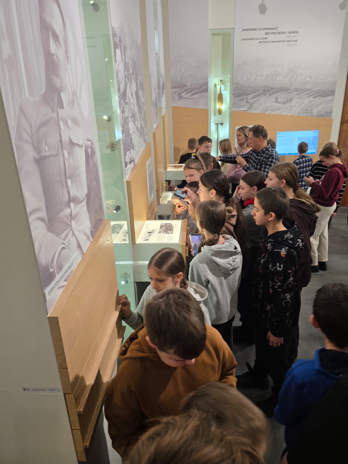 16.01.2026 klasy 5 udały się na wycieczkę, która była okazją do bliższego poznania kultury Podhala oraz najważniejszych miejsc związanych z historią miasta Zakopane. Nasze zwiedzanie rozpoczęliśmy od gmachu głównego Muzeum Tatrzańskiego, gdzie zapoznaliśmy się z bogatą historią regionu, postaciami waznymi dla historii Zakopanego i Podhala, tradycjami góralskimi, strojami ludowymi oraz przyrodą Tatr. Zgromadzone eksponaty i ciekawe opowieści przewodnika pozwoliły nam lepiej zrozumieć wyjątkowość tego miejsca.