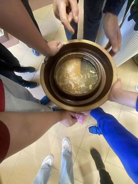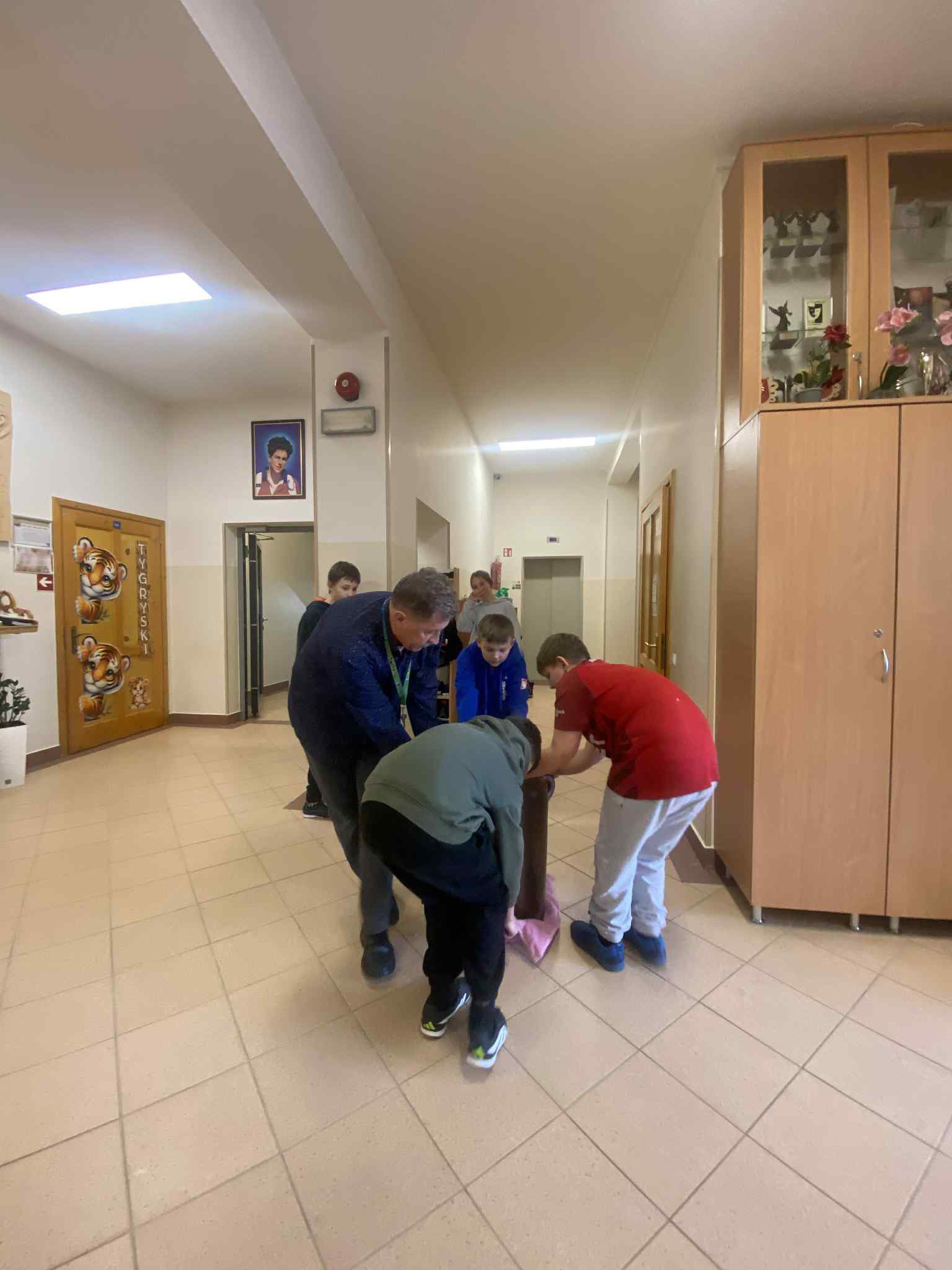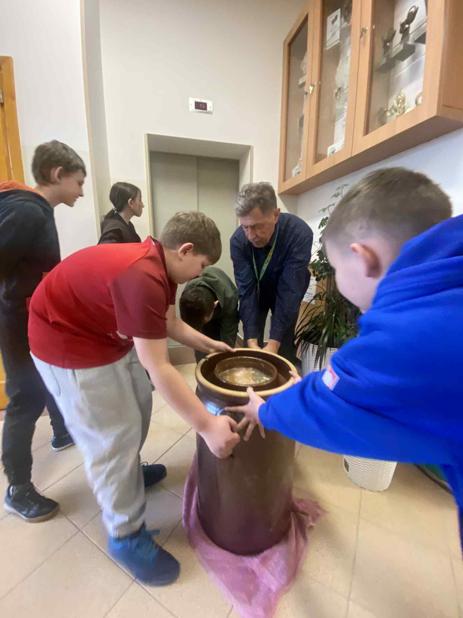 Coroczna akcja kiszenia kapusty przez przedszkolaków rozpoczęła się 13. listopada br. Naszym dzielnym młodszym kolegom pomagały kl.1b i 3b. Po udeptaniu… nogami (!) poszatkowanej kapusty z marchewką i przyprawami w dużym (50 l) garnku zostawiliśmy ją na tydzień w sali jednej z zerówek. Oczywiście dzieci deptały w specjalnie przygotowanych kaloszach. Później mogły codziennie obserwować przebieg procesu fermentacji, ale też poczuć specyficzny zapach. Pewnie większości się nie spodobał. No, ale cóż było zrobić? Po tygodniu nasza prawie ukiszona kapusta została ”przebita” drewnianym drążkiem i pozostała jeszcze kilka dni w tej samej sali. 25. listopada (wczoraj) z kl. 6 b sprawdziliśmy efekty naszych działań próbując smaku soku czyli „kwaśnicy”. Niektórzy koneserzy wypili po dwa kubki. Smakowała wybornie tzn., że kapusta się świetnie ukisiła. Trzeba było ją więc wynieś do najzimniejszego miejsca w szkole czyli do piwnicy. Silni chłopcy z 6b z pomocą ofiarnych koleżanek przetransportowali ogromny, ważący dobrze ponad 100 kg, gar gliniany do piwnicy, aby maksymalnie spowolnić proces fermentacji. Pozostało jeszcze przykryć go specjalnie dopasowaną pokrywą i odciąć dostęp powietrza zalewając rant garnka olejem. Teraz nasza smakowita, ekologiczna kapusta czeka na szkolną Wigilię! Życzymy smacznego!