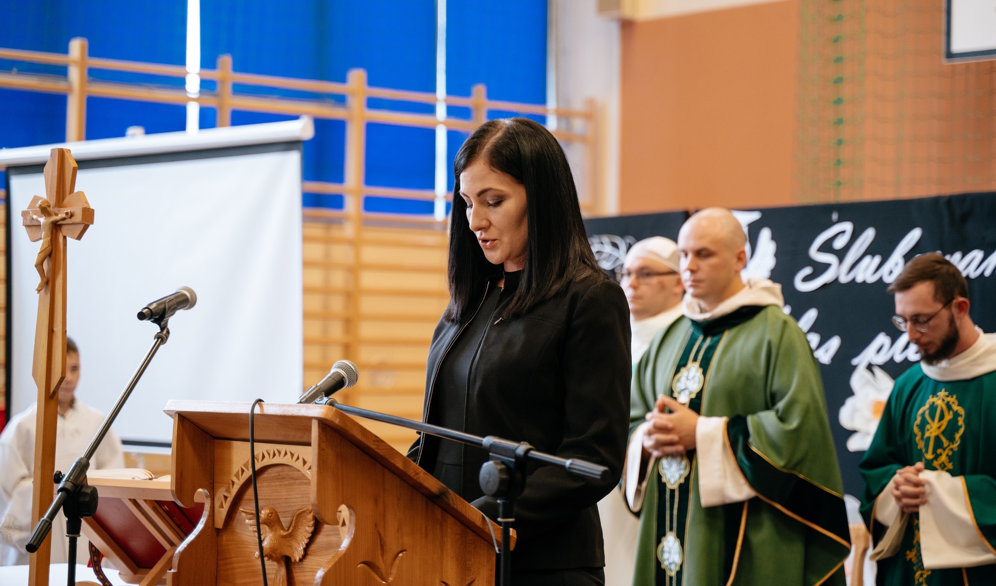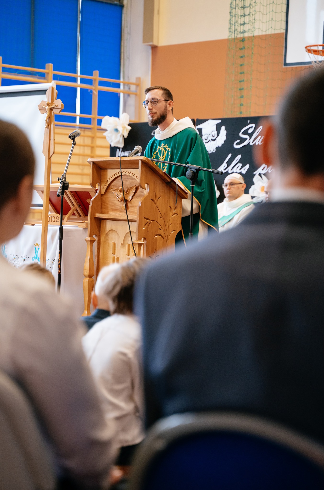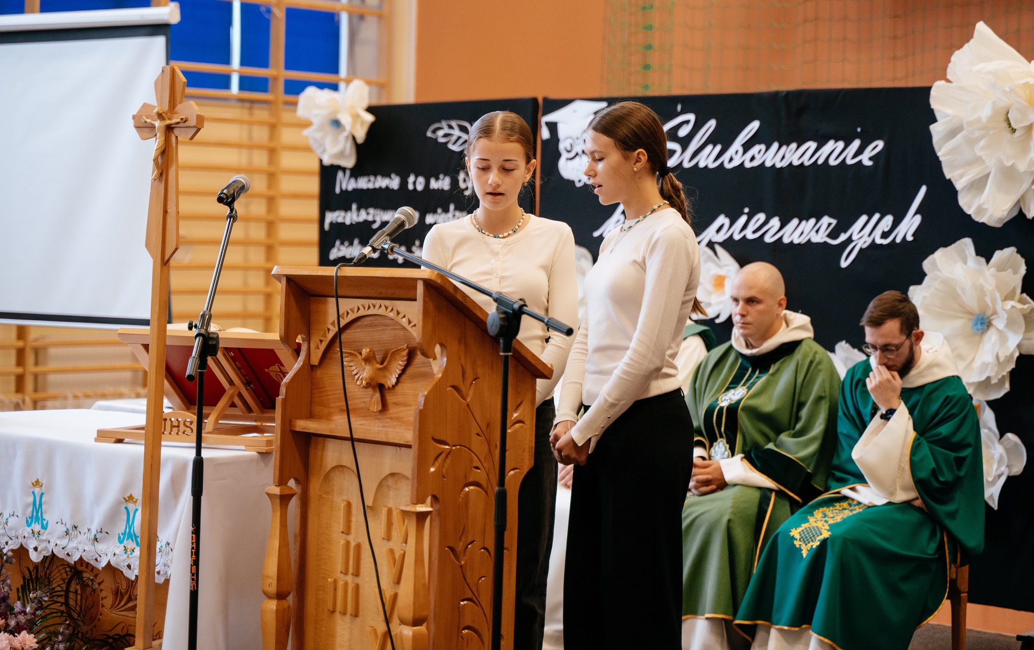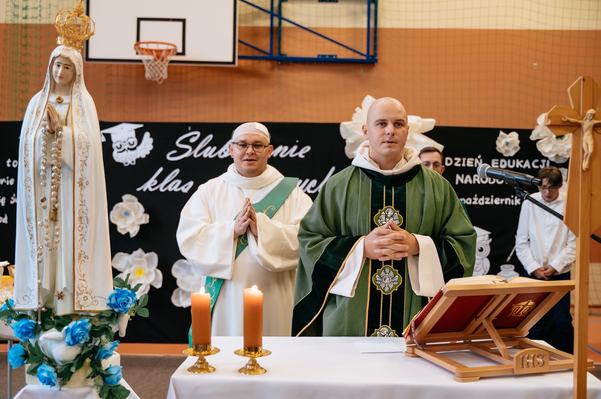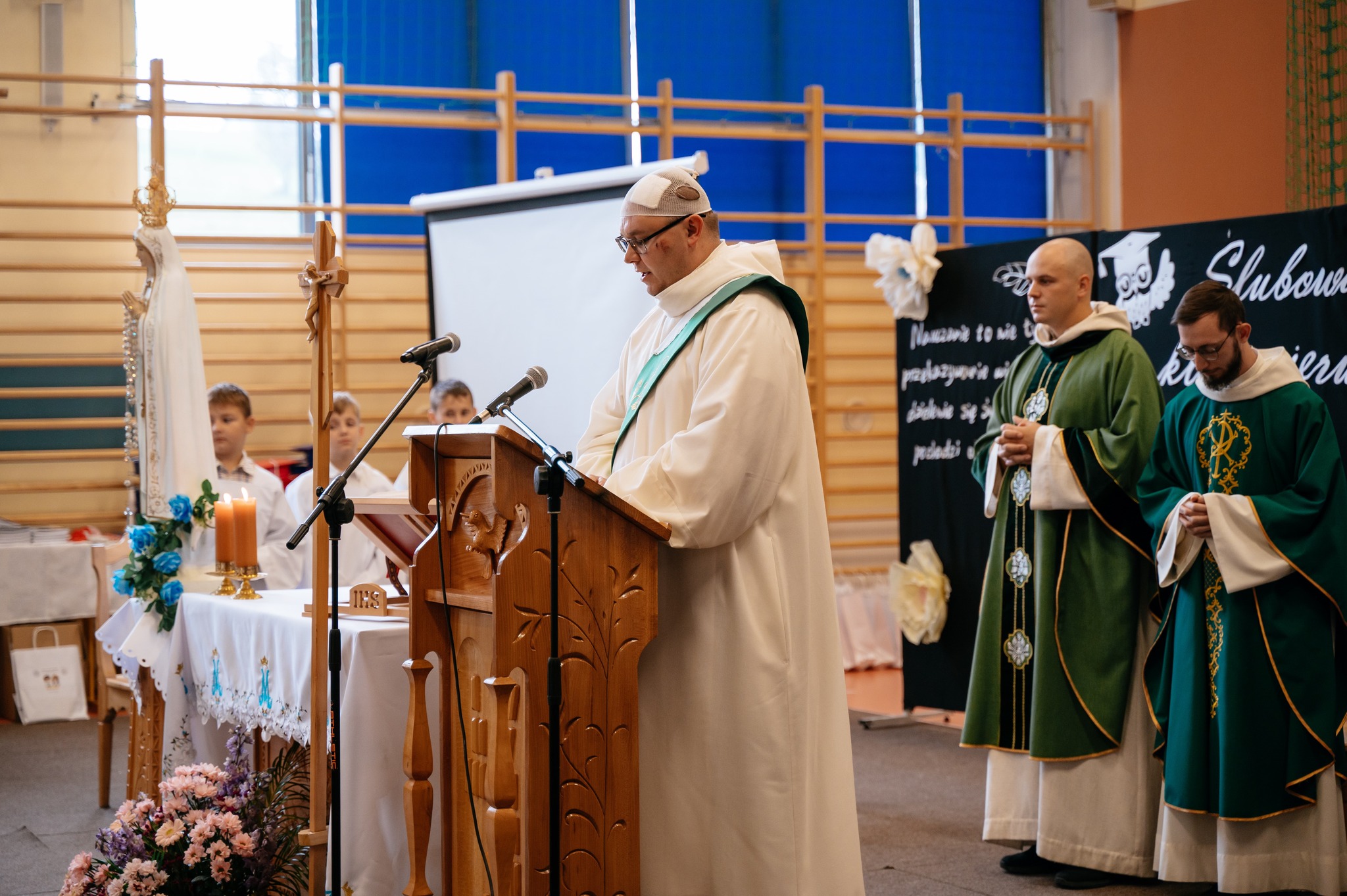 Uroczystość rozpoczęła się Mszą świętą, w której uczestniczyła cała społeczność szkolna oraz zaproszeni rodzice. Eucharystię odprawili ojciec Sylwester, ojciec Dawid oraz ojciec Marcin, którym dziękujemy za wspólną modlitwę i piękne słowa skierowane do uczniów oraz nauczycieli.