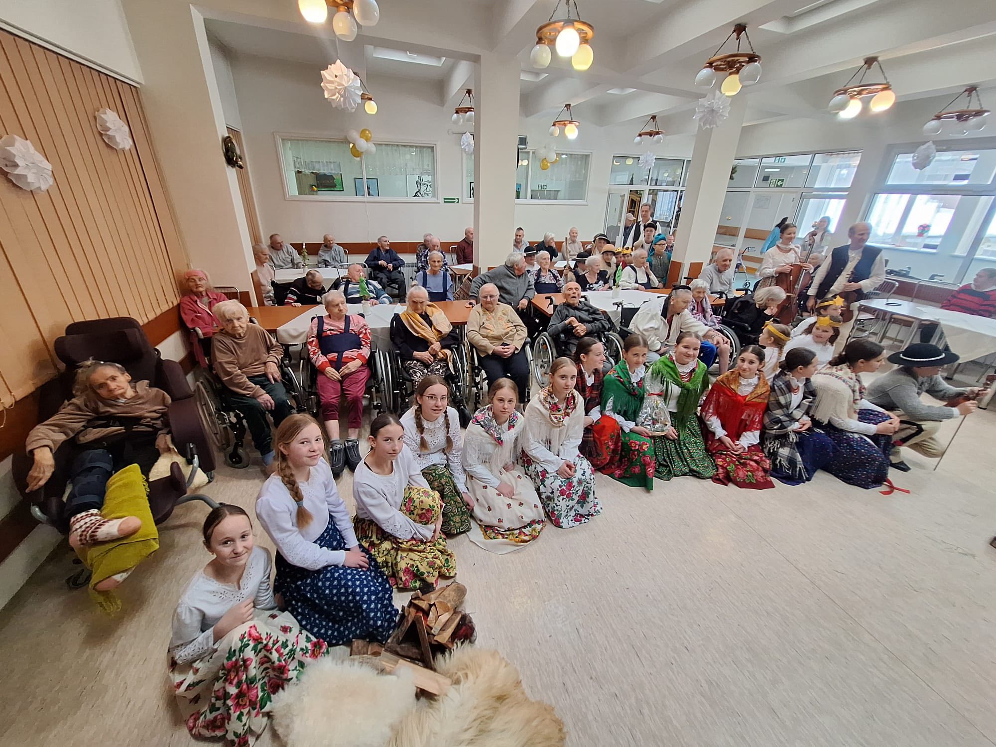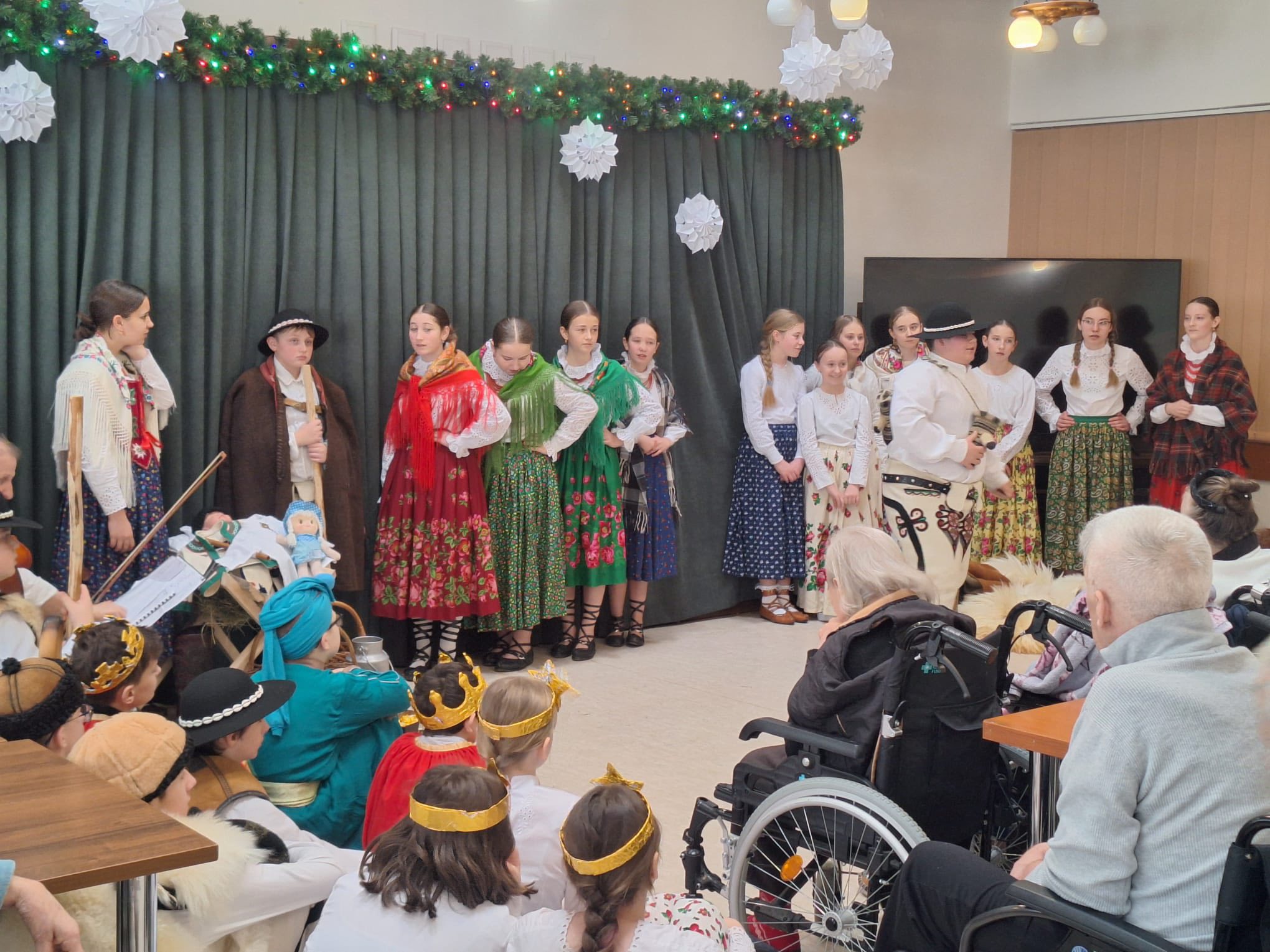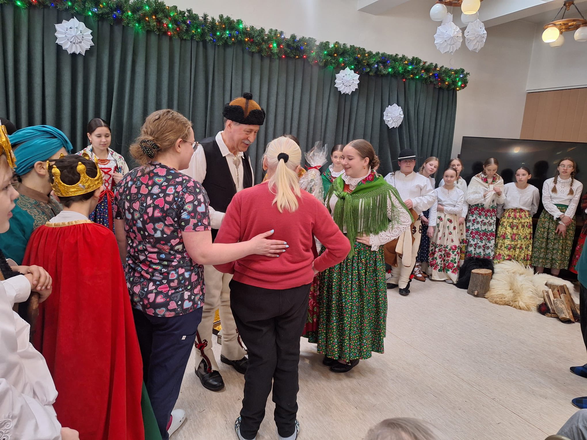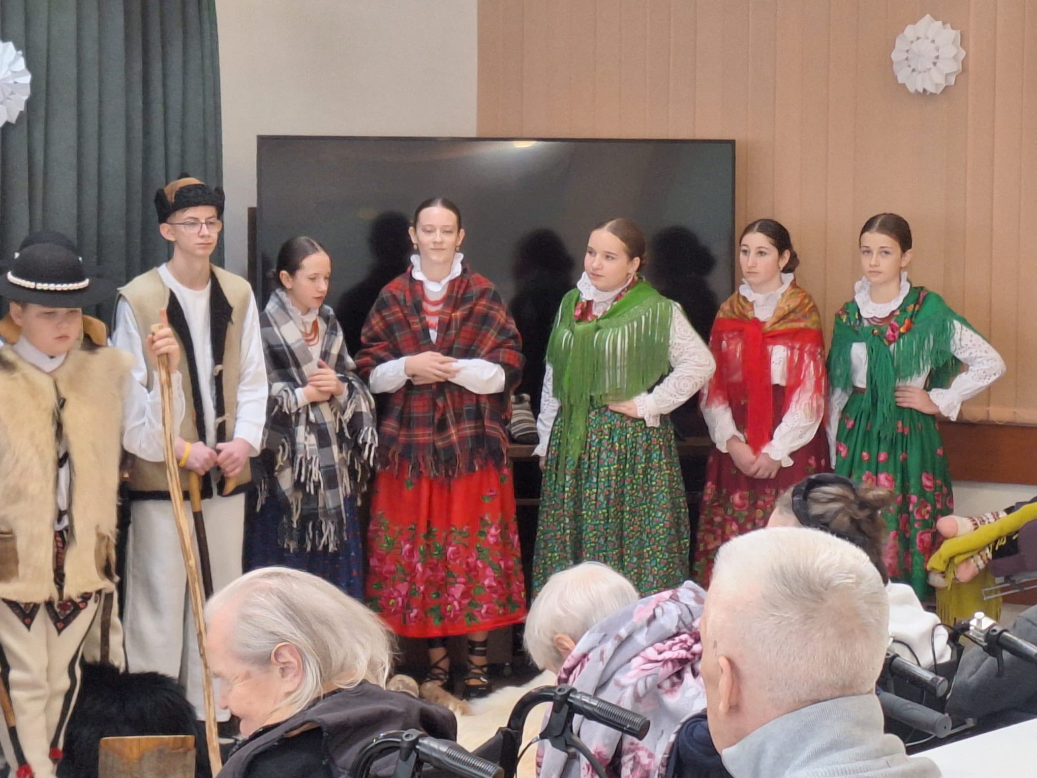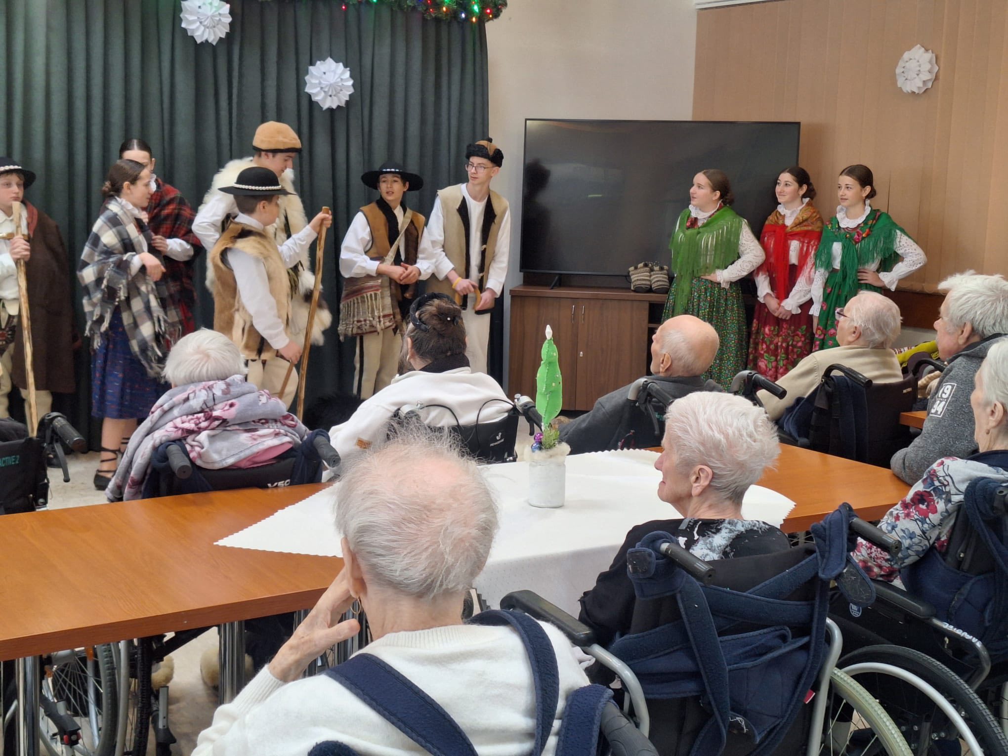 Po raz kolejny "młodość spotkała się z doświadczeniem..." Tym razem uczniowie naszej szkoły mieli przyjemność przedstawić góralskie jasełka, które tym razem na moment zatrzymały czas w Domu Pomocy Społecznej "Smrek" w Zaskalu oraz w Domu Seniora "Tatrzańska Jesień" w Skrzypnem. Tak jak ostatnio w blasku betlejemskiej gwiazdy i dźwiękach kolęd, seniorzy odnaleźli cząstkę własnej młodości, a nasi uczniowie – autentyczne wzruszenie i szacunek. Pensjonariusze nie tylko oglądali, ale również aktywnie włączyli się w śpiewanie kolęd, co stworzyło wyjątkową, integrującą atmosferę. To było spotkanie, które pokazało, jak ważna jest bliskość człowieka i wspólne świętowanie.