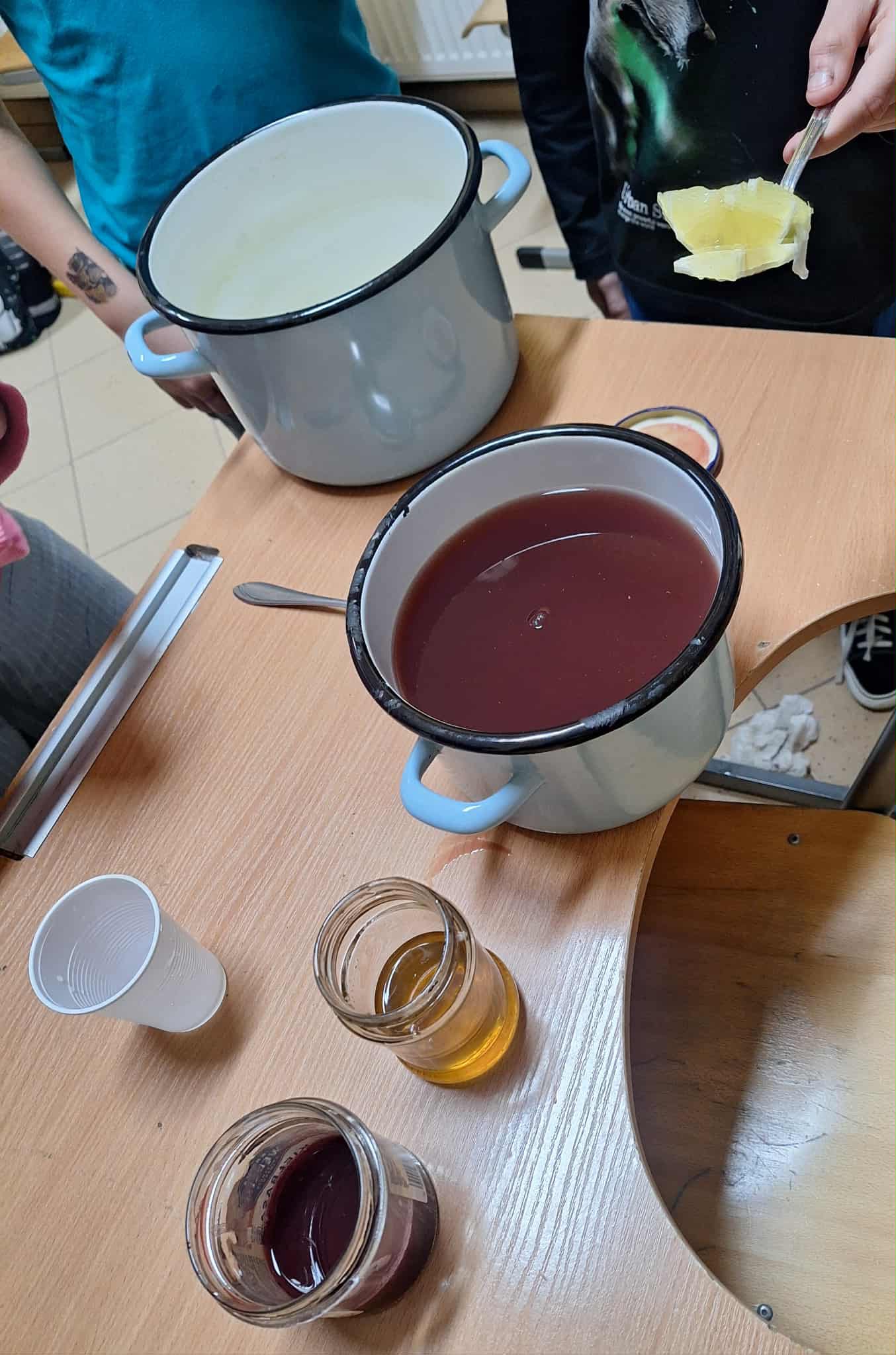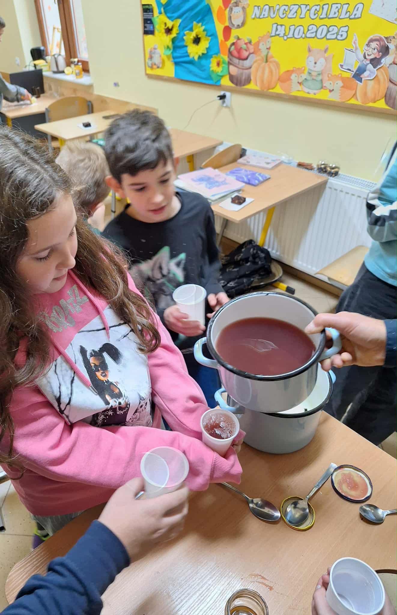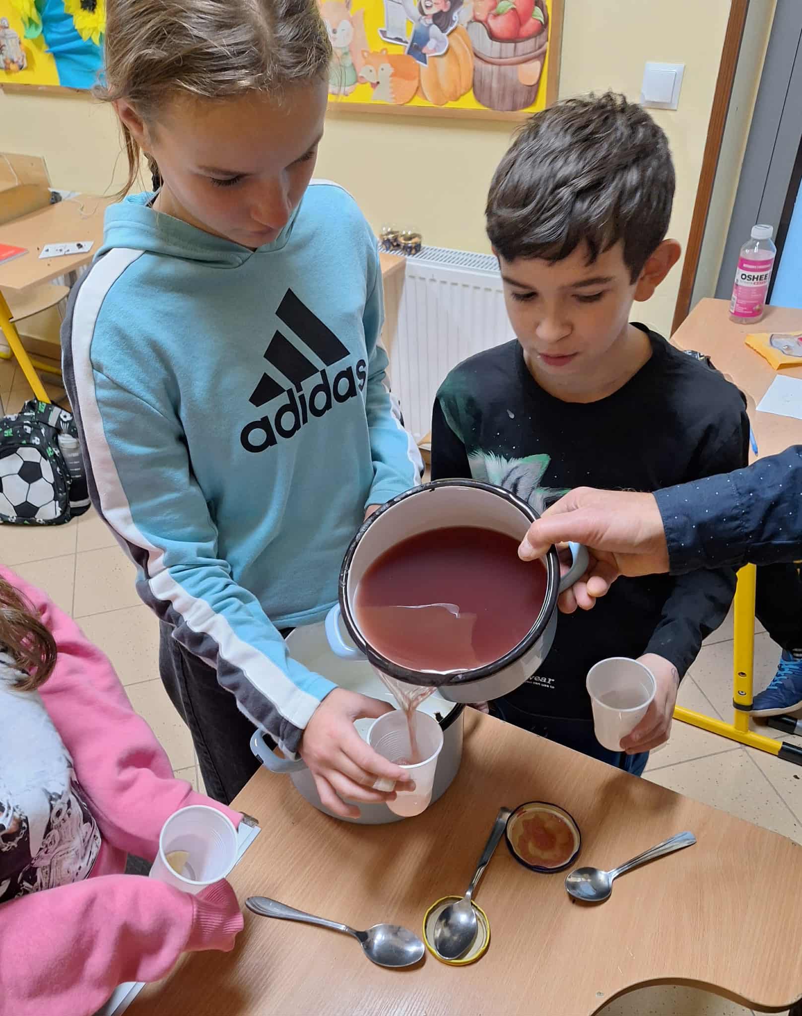 Jesień to czas przeziębień i osłabionej odporności, dlatego na lekcjach naszego dziedzictwa uczyliśmy się jak leczyły nasze prababcie oraz jakich używały ziół, aby zachować zdrowie. Dzisiaj uczniowie klasy VC przygotowywali herbatę z kwiatu lipy. Najpierw zalewali zioła wrzątkiem, następnie studzili je na zewnątrz, a gdy herbata miała odpowiednią temperaturę dodano do niej miód, sok maliowy, a także cytrynę. Sporą niespodzianką bylo żucie plastra miodu, który jedna z uczennic przyniosła prosto od pszczelarza. Pozostali uczniowie również zadbali o to, aby produty były najlepszej jakości dlatego przyniesli domowe przetwory. Teraz z pewnością żadne jesienne wirusy nie będą im straszne.