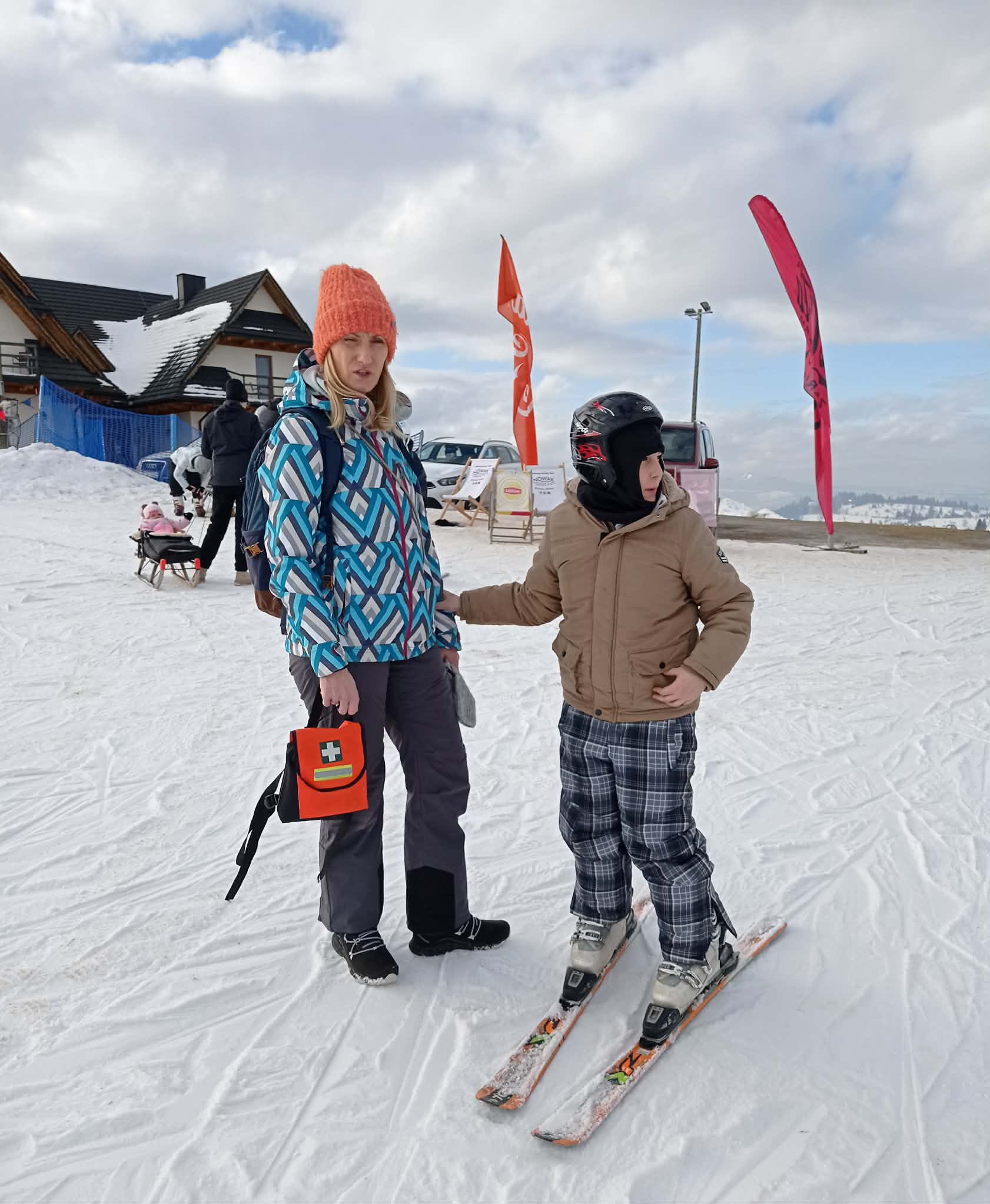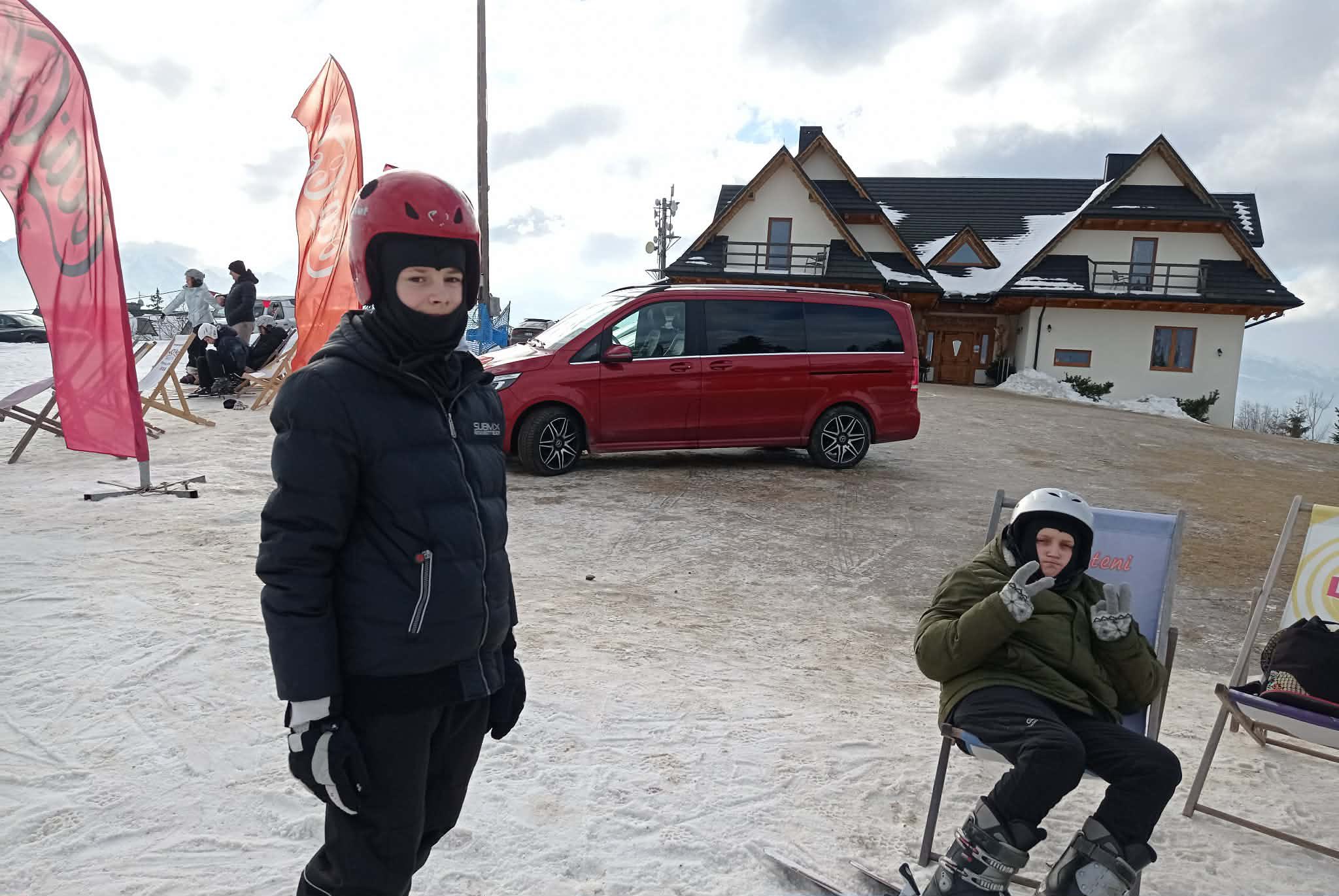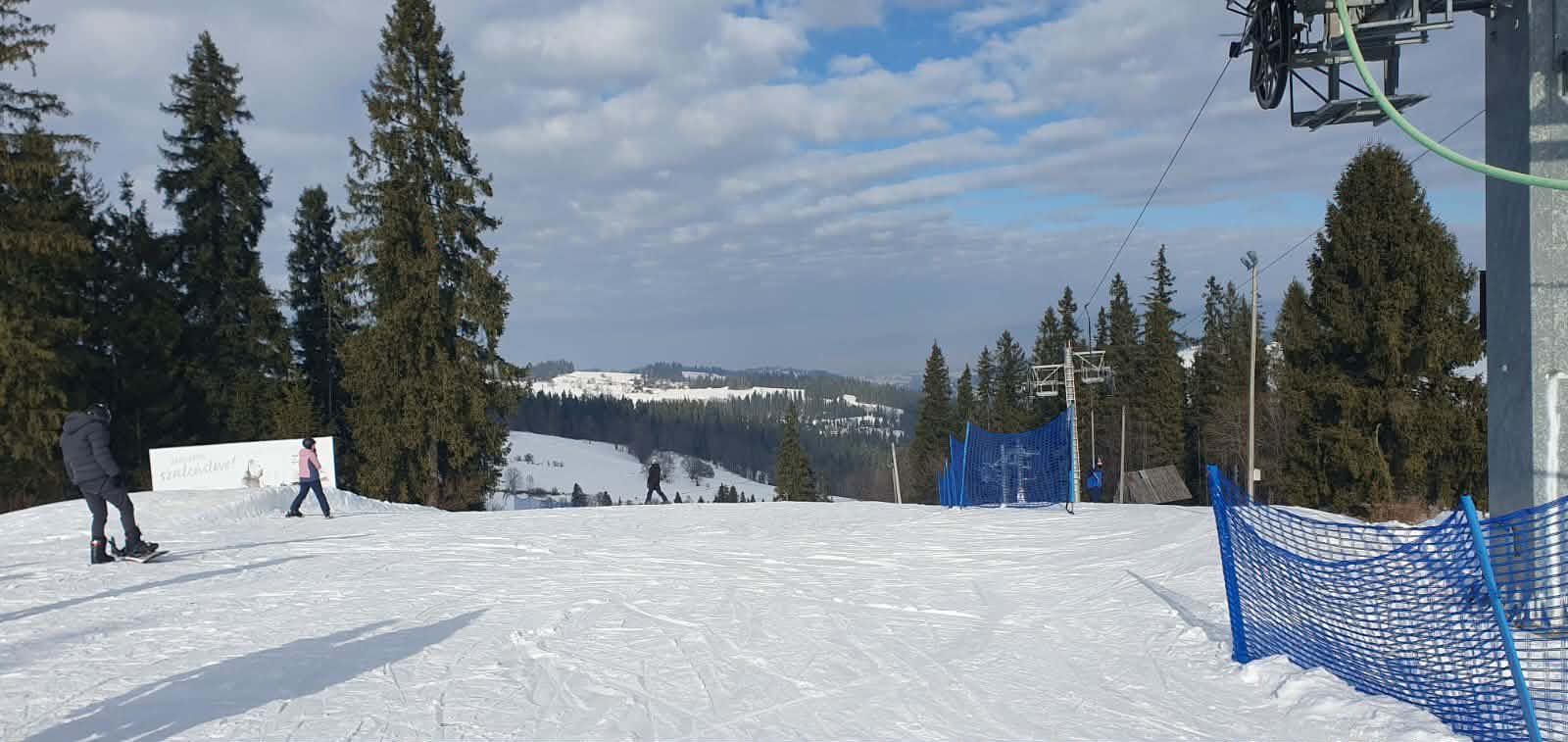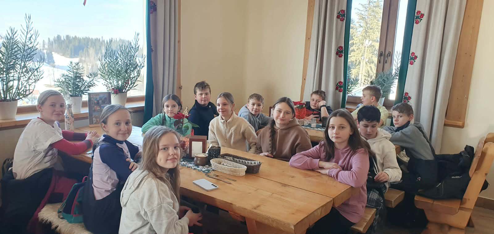 Po wyczerpującej, ale jakże przyjemnej frajdzie na stoku przyszedł czas na odpoczynek i ciepły posiłek w karczmie widokowej znajdującej się obok wyciągu narciarskiego, gdzie wszyscy zostali życzliwie przywitani przez właścicieli i ugoszczeni pysznym obiadem. Zwieńczeniem dnia były pamiątkowe zdjęcia na tarasie widokowym na tle panoramy Tatr (szkoda, że tego dnia były troszkę spowite mgłą ).