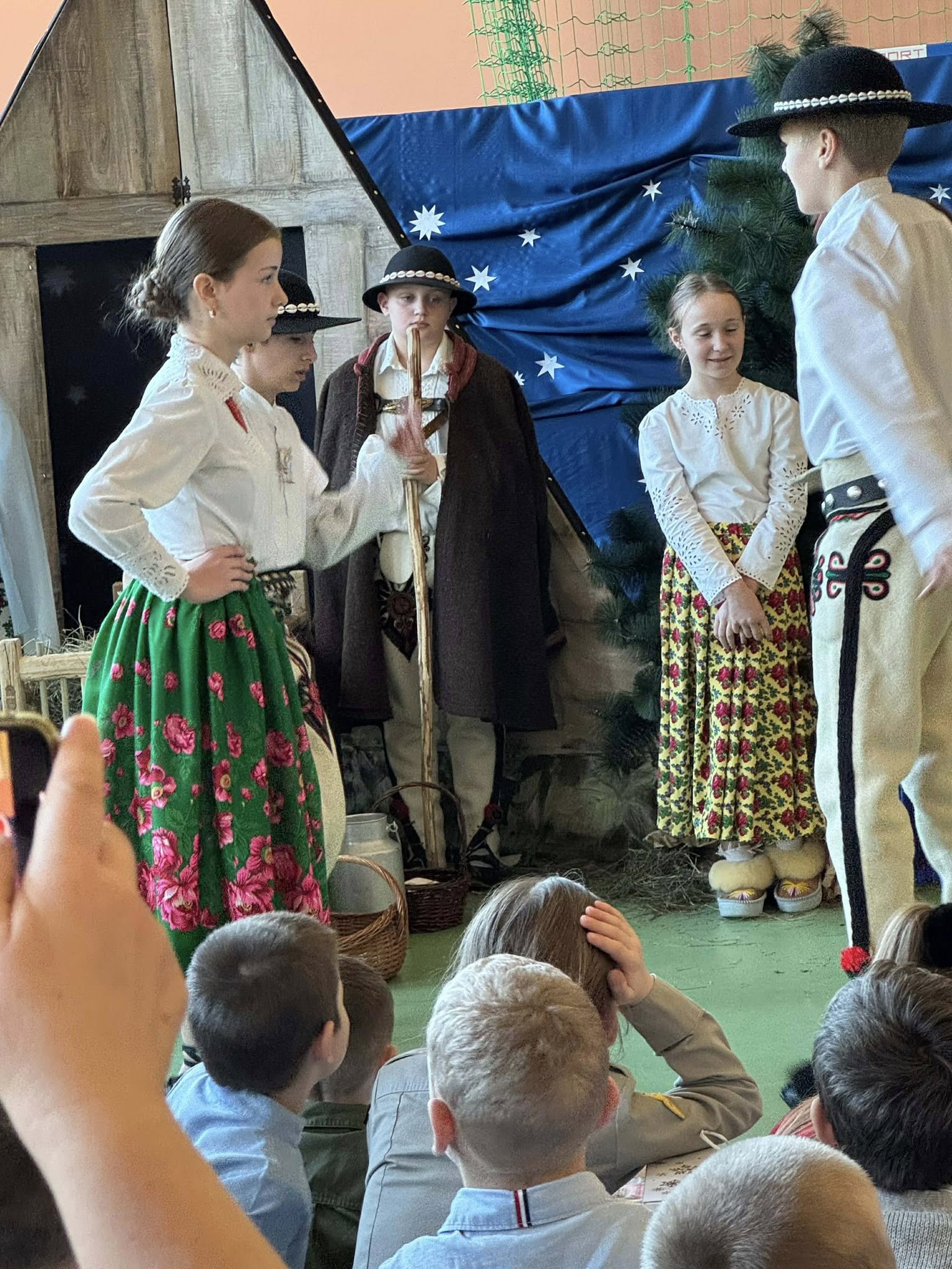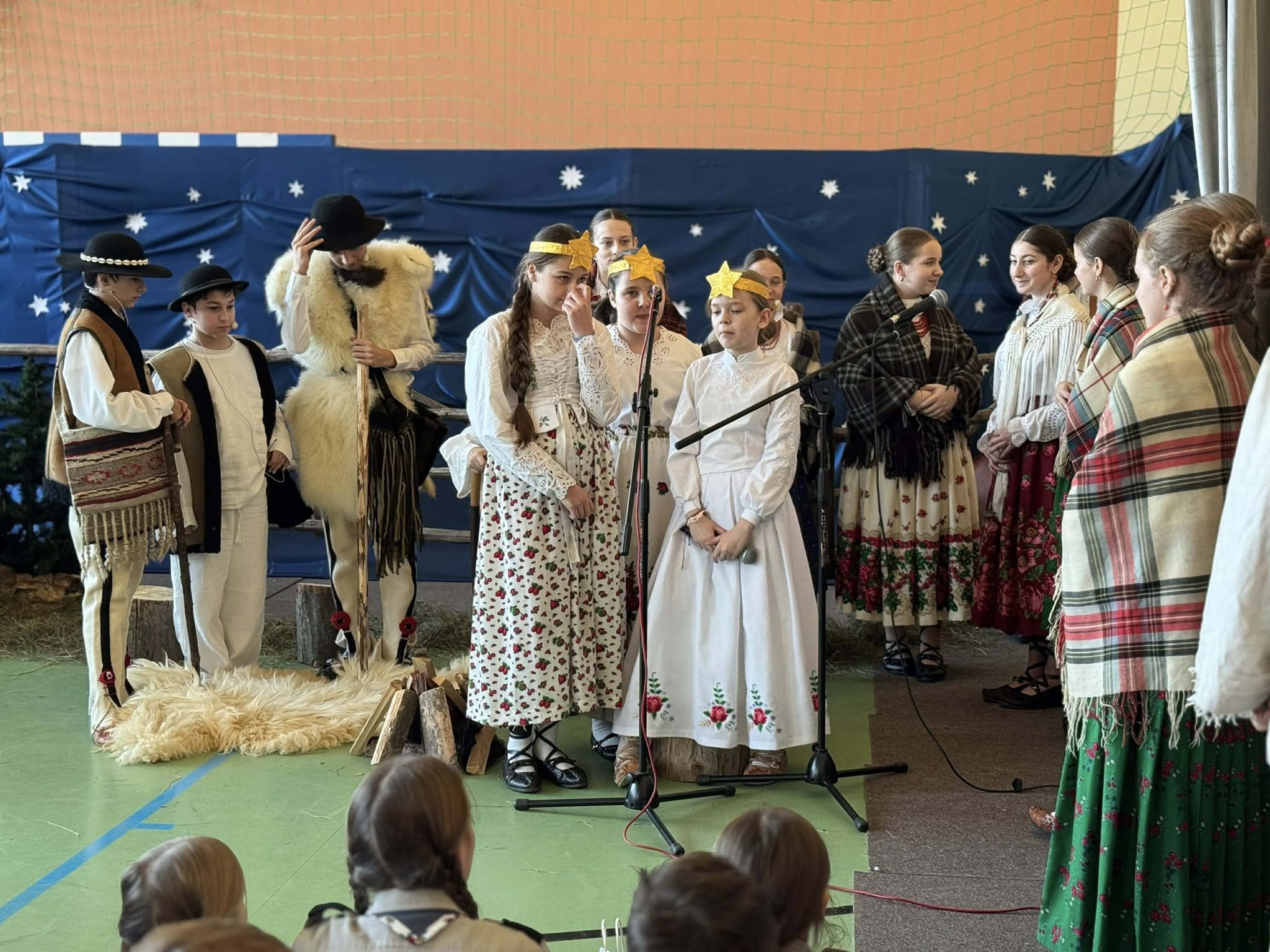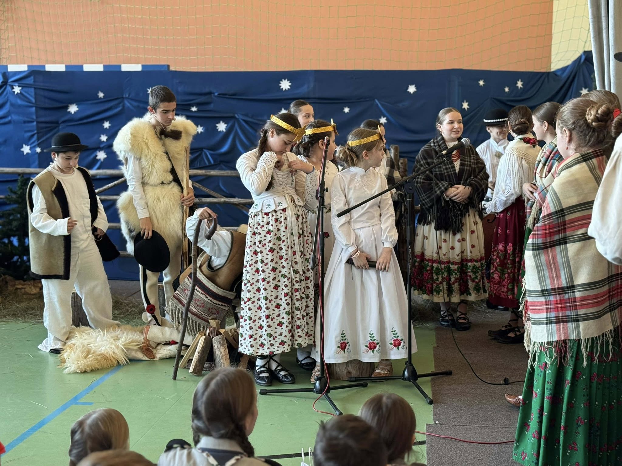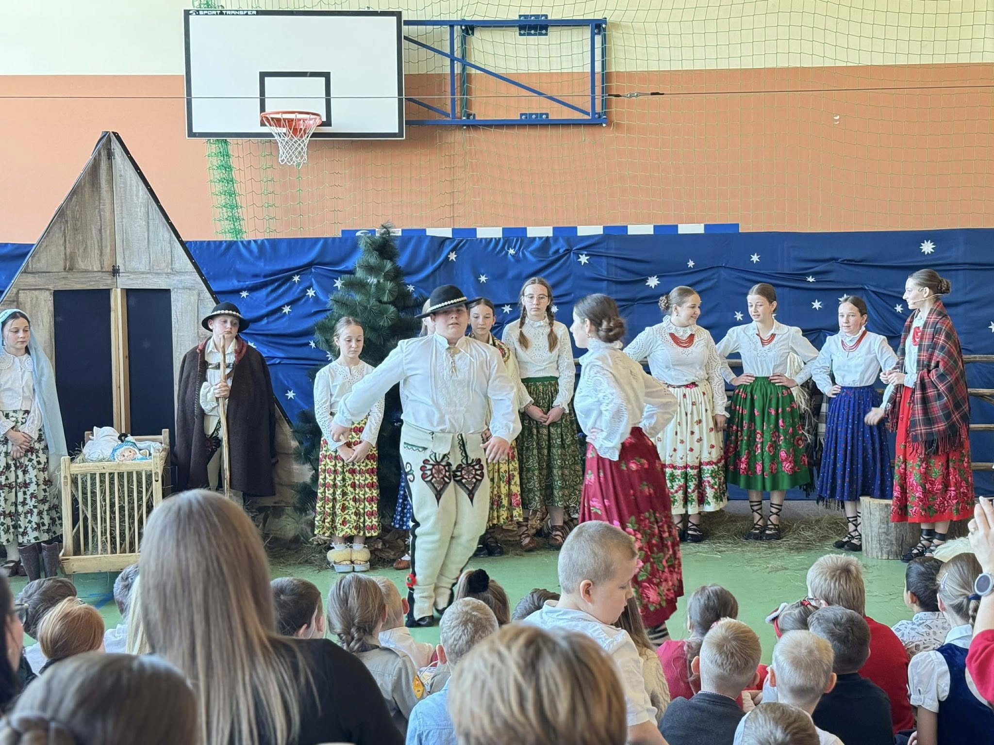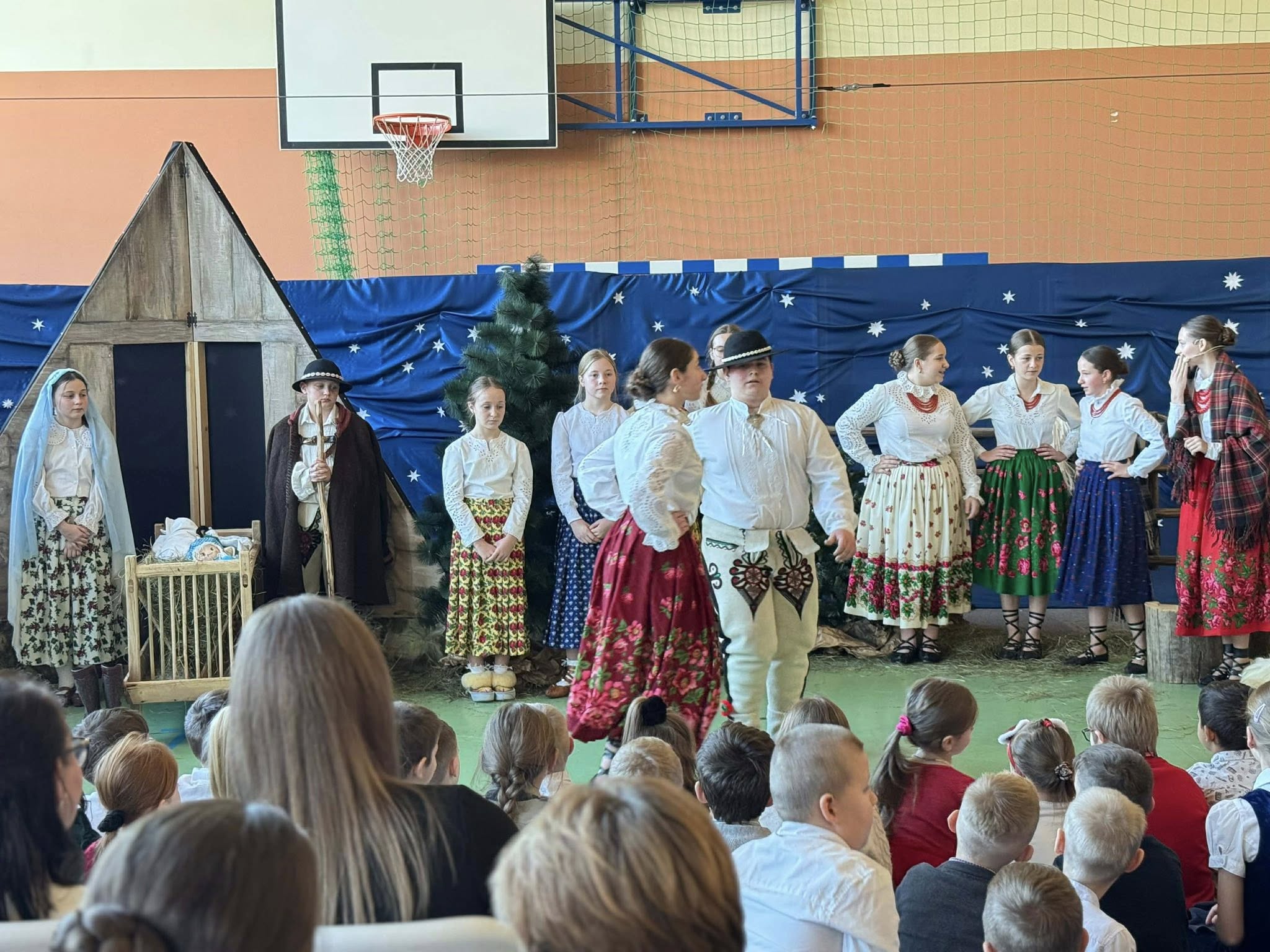 Następnie mieliśmy zaszczyt podziwiać piękne, góralskie jasełka przygotowane przez szkolne koło teatralne wraz z opiekunami. Barwne stroje, tradycyjna muzyka oraz autentyczne emocje młodych aktorów sprawiły, że wszyscy mogliśmy na nowo przeżyć tajemnicę narodzin Jezusa.