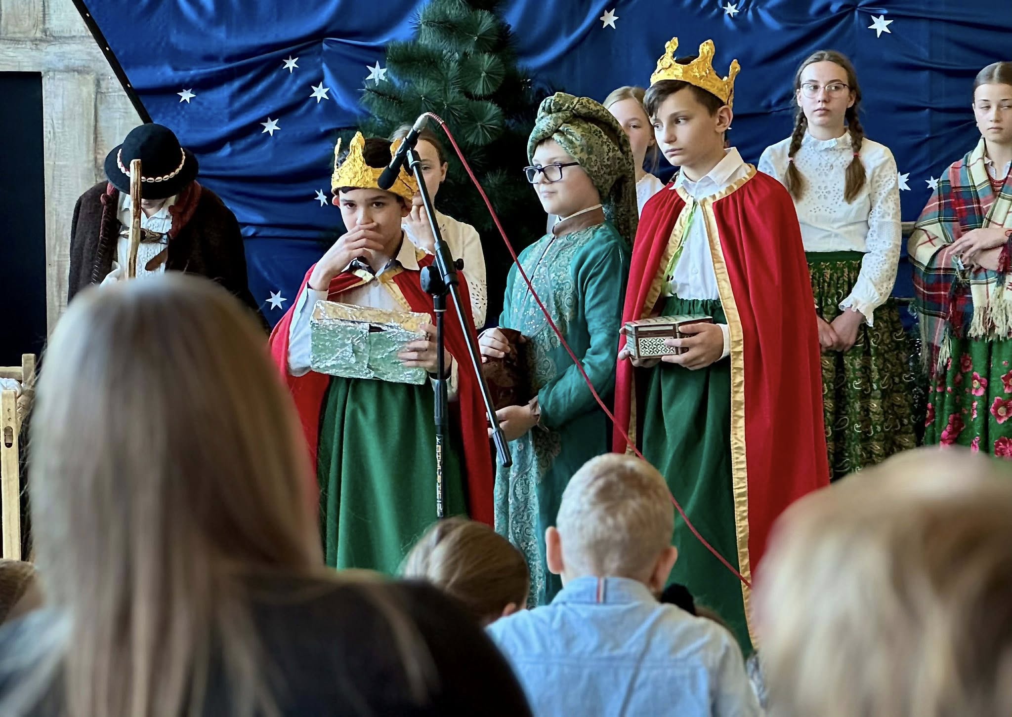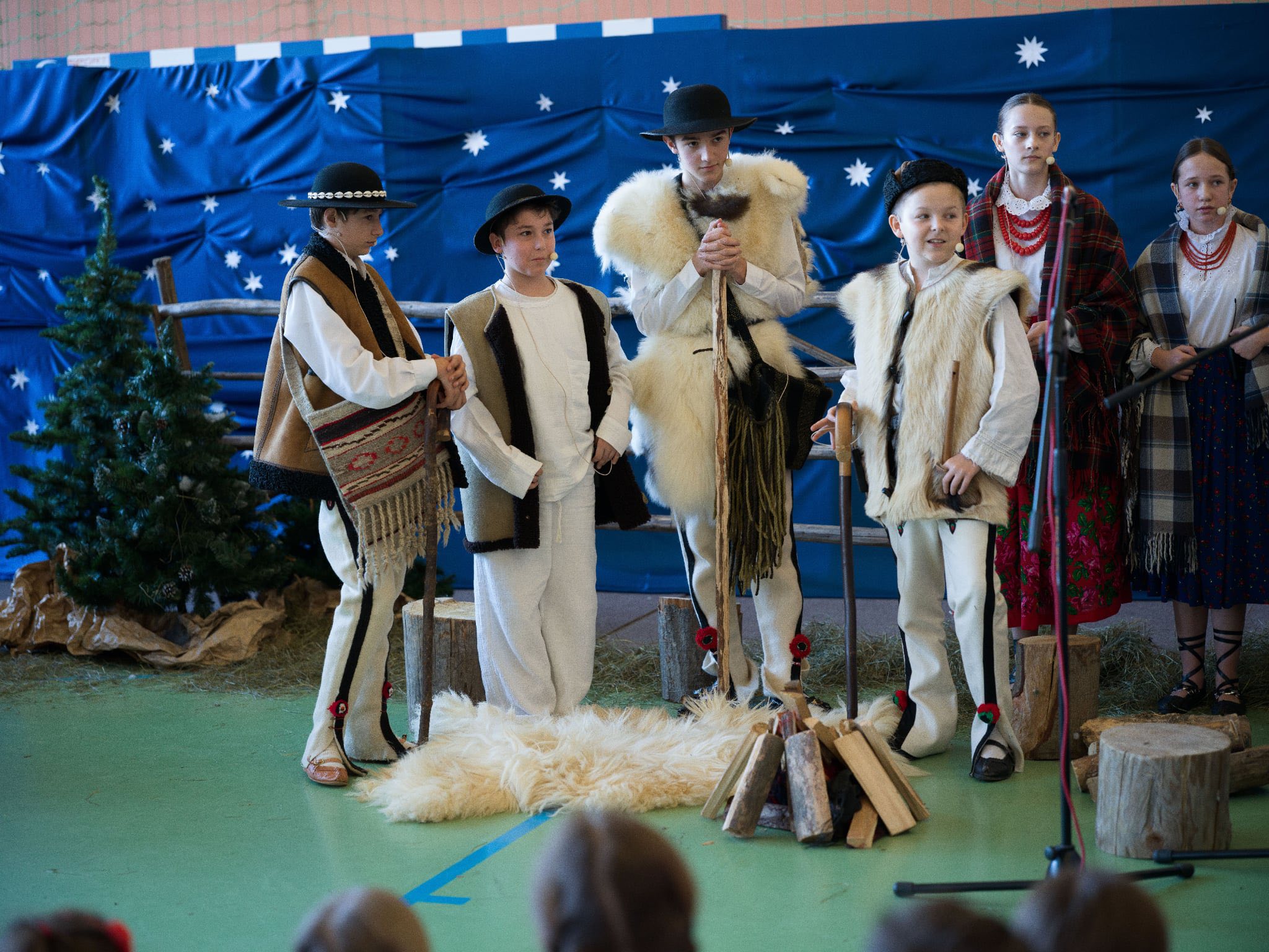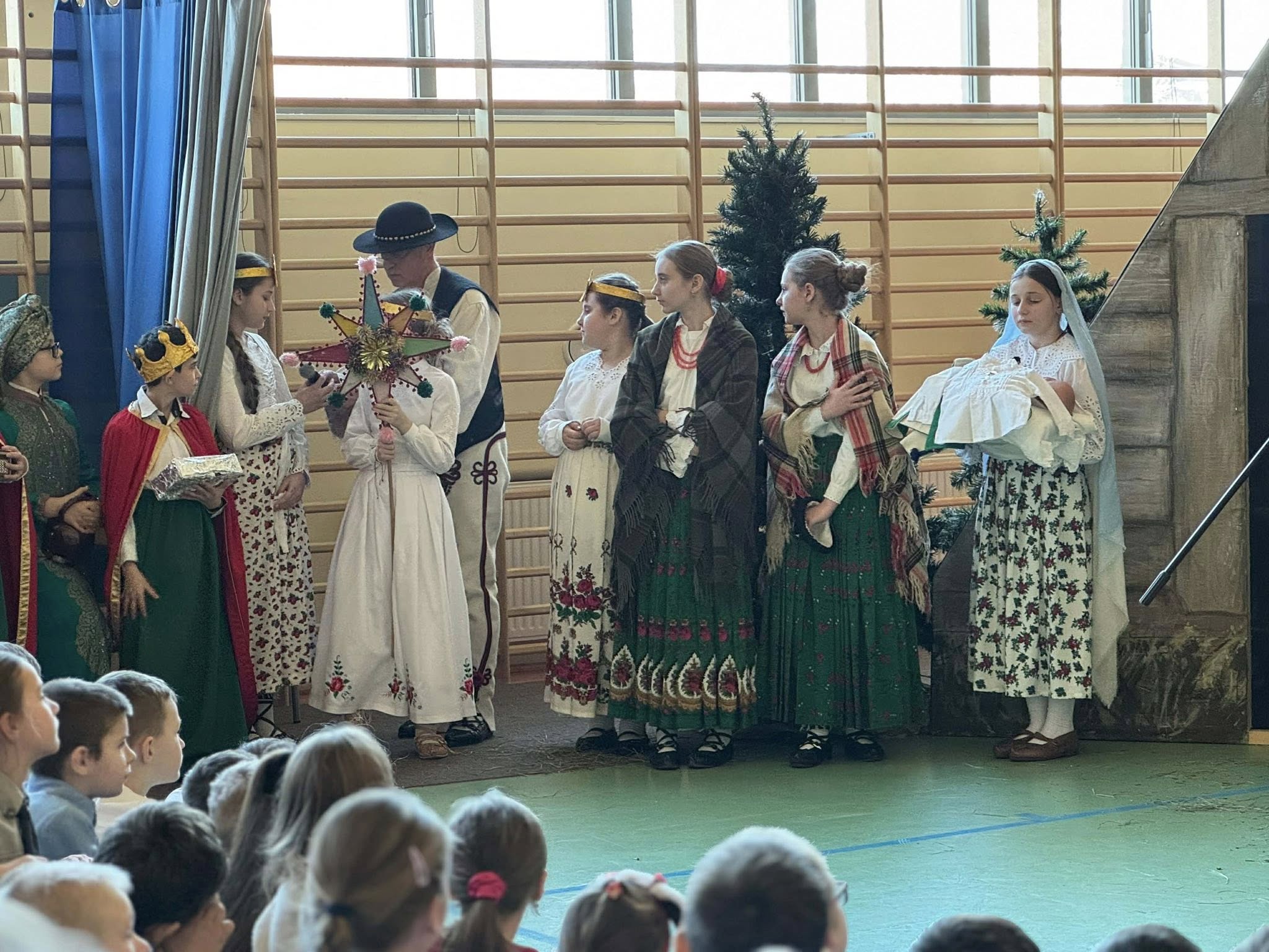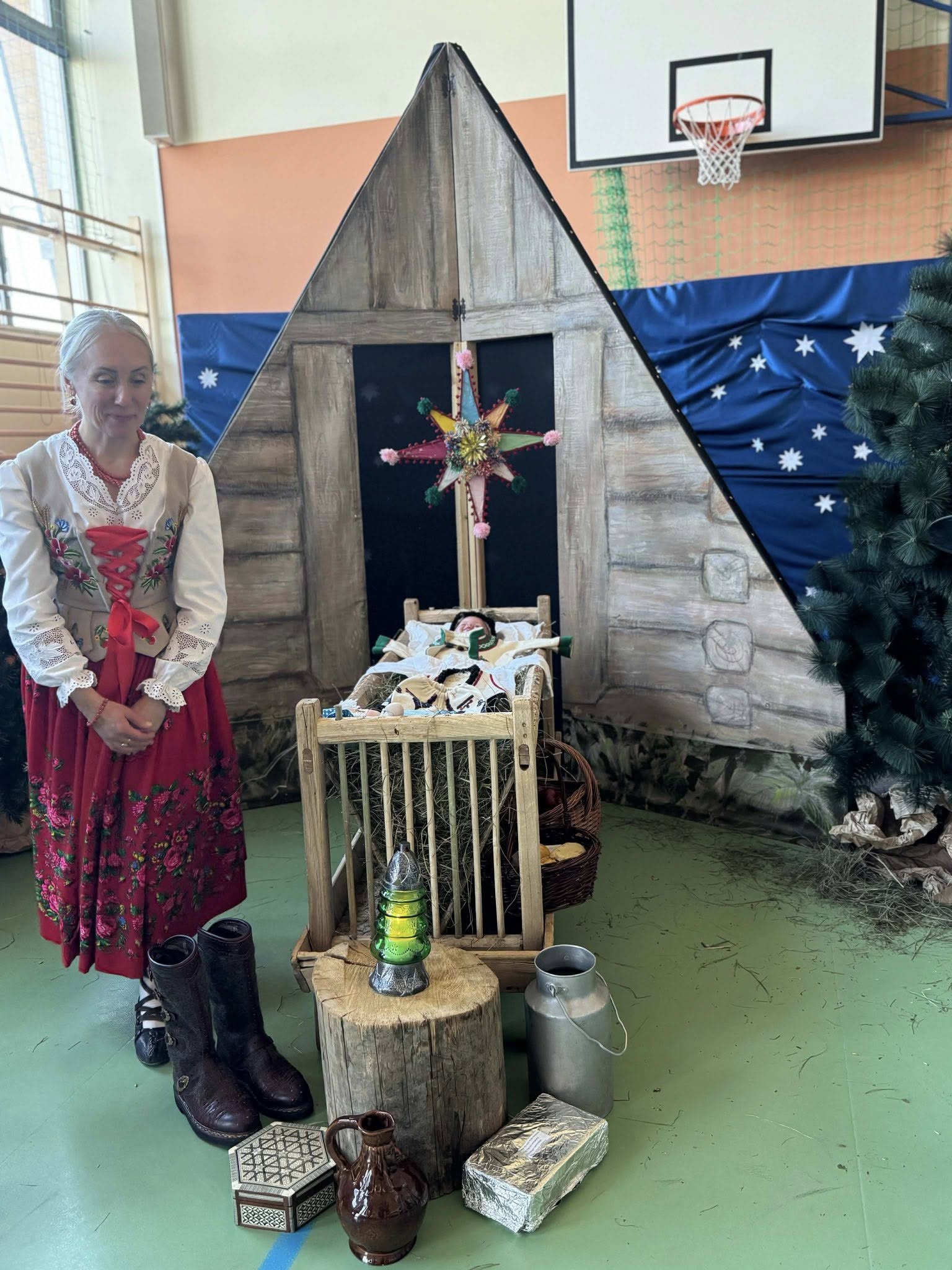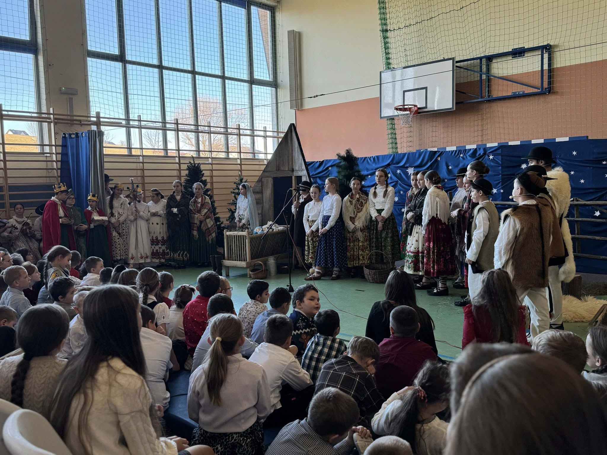Następnie mieliśmy zaszczyt podziwiać piękne, góralskie jasełka przygotowane przez szkolne koło teatralne wraz z opiekunami. Barwne stroje, tradycyjna muzyka oraz autentyczne emocje młodych aktorów sprawiły, że wszyscy mogliśmy na nowo przeżyć tajemnicę narodzin Jezusa.