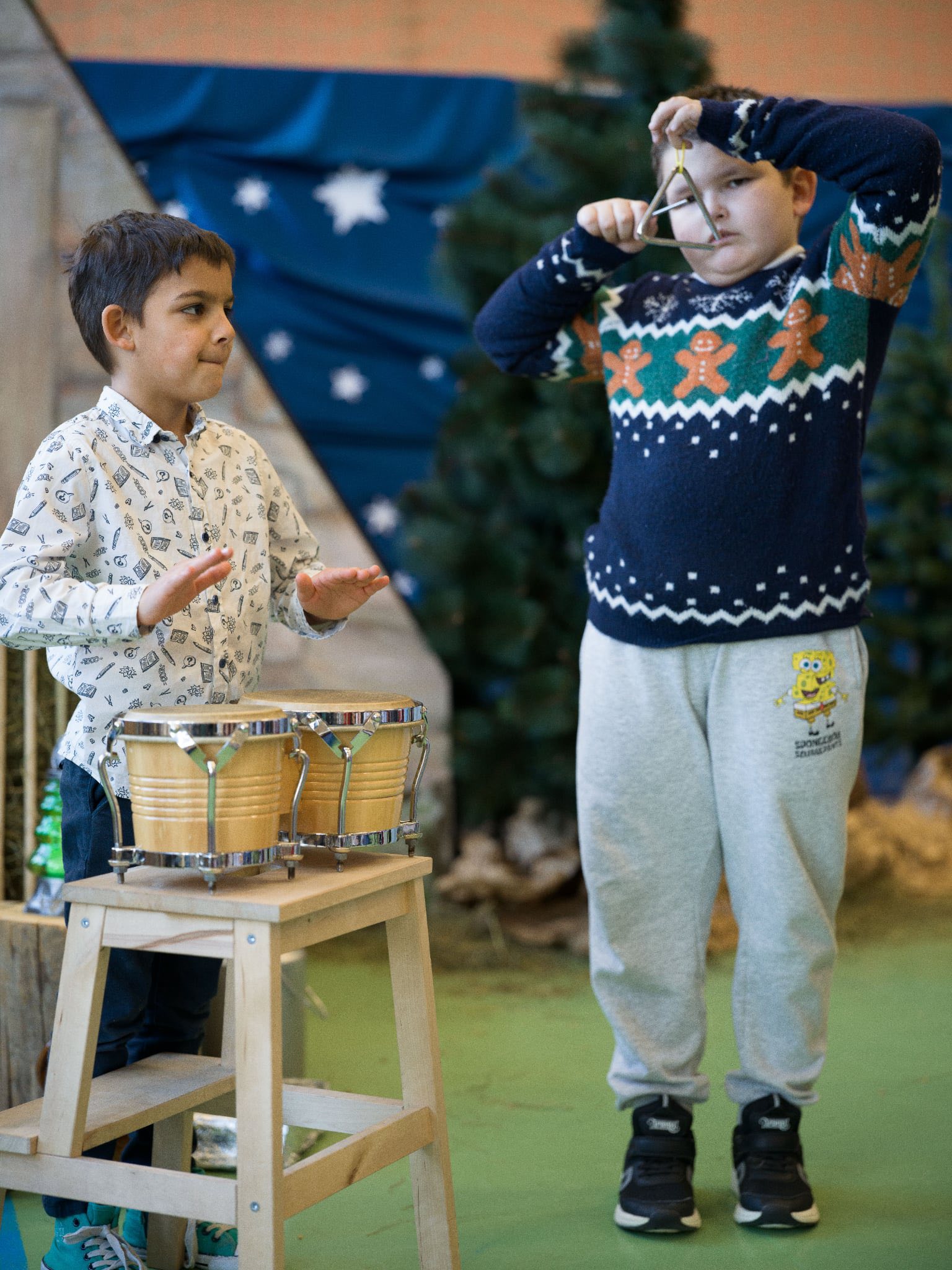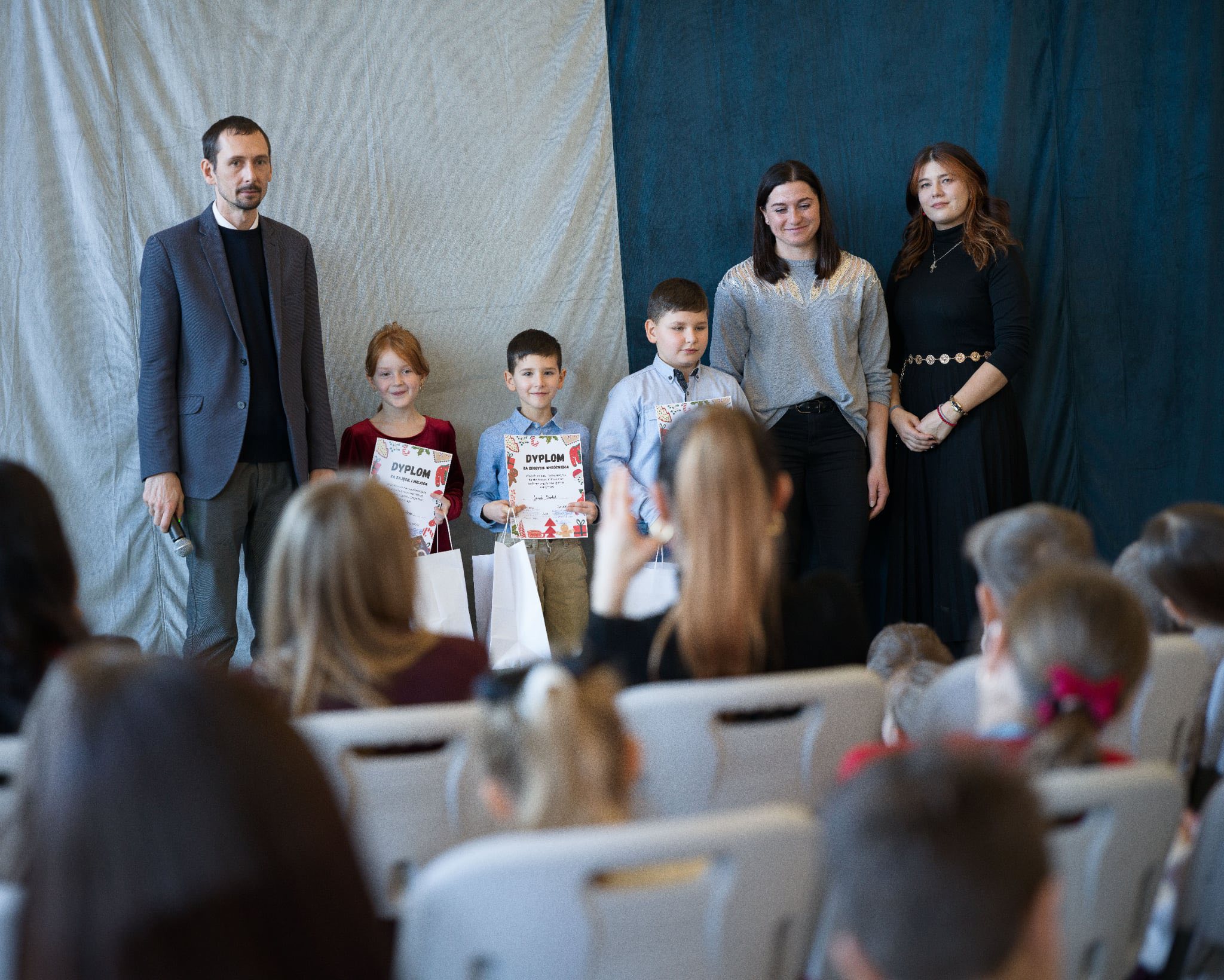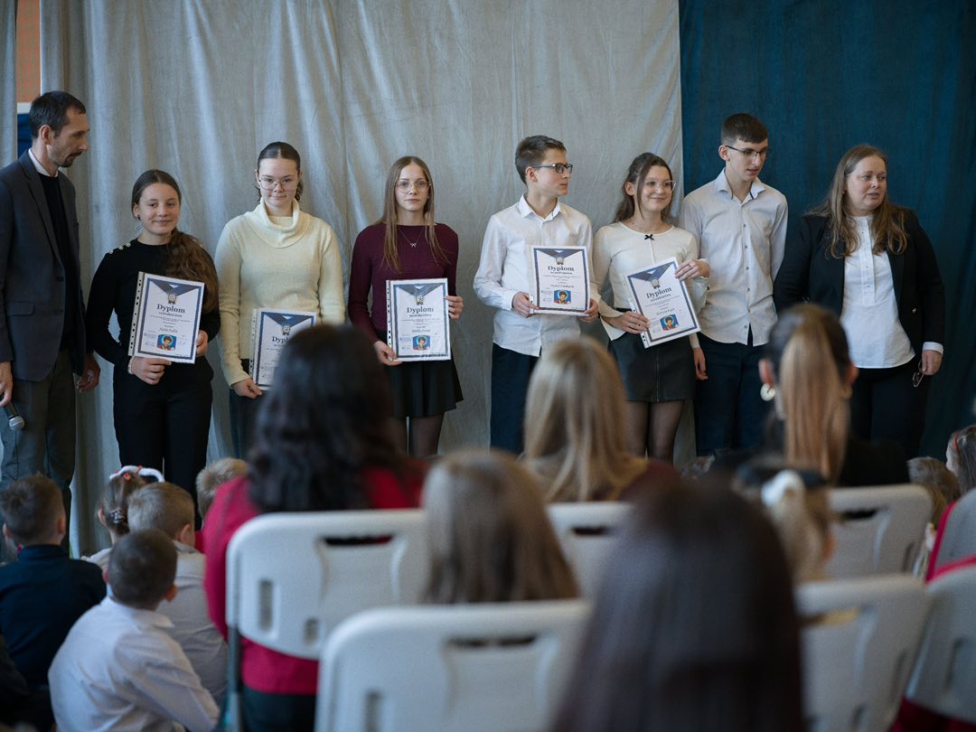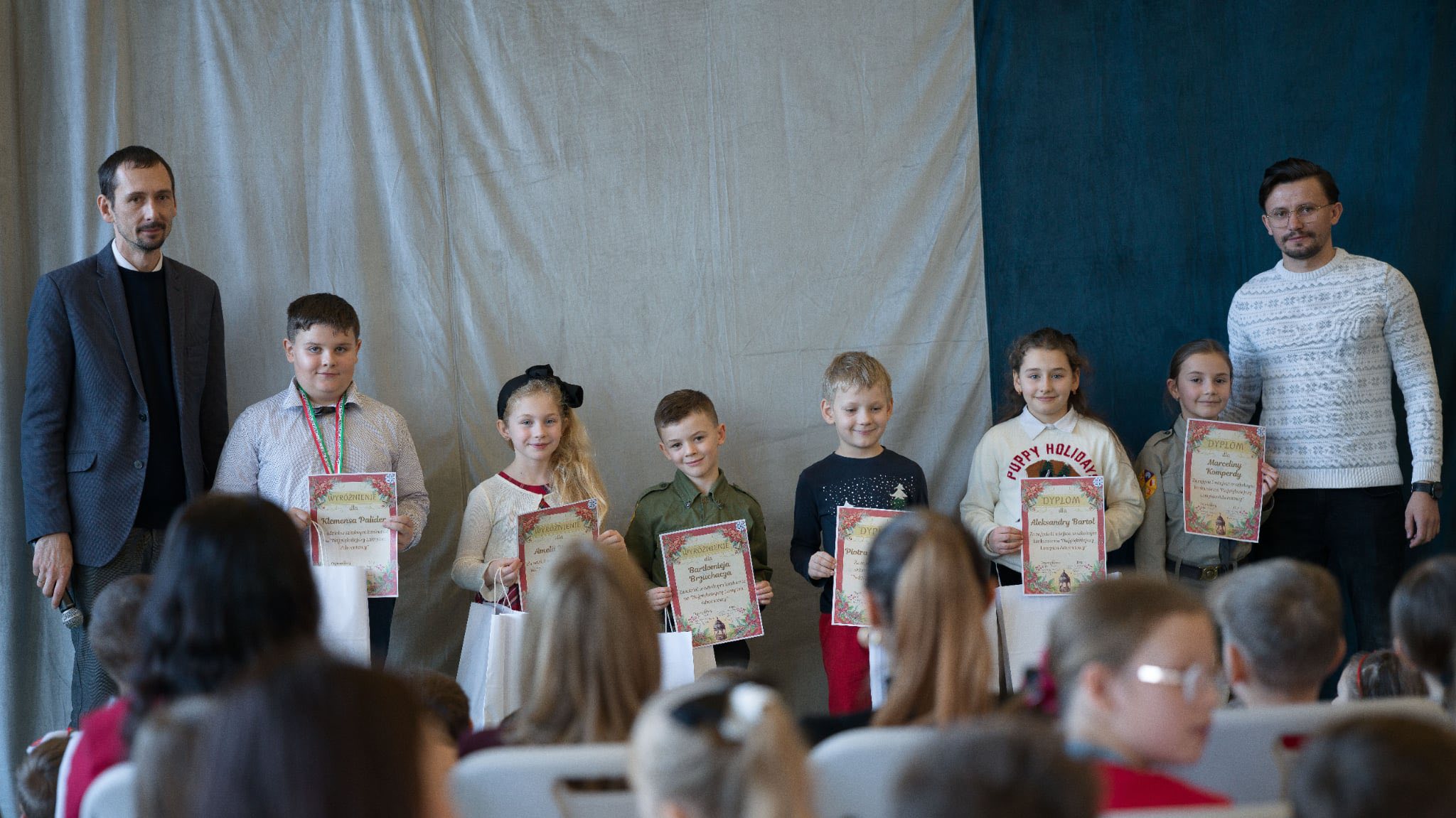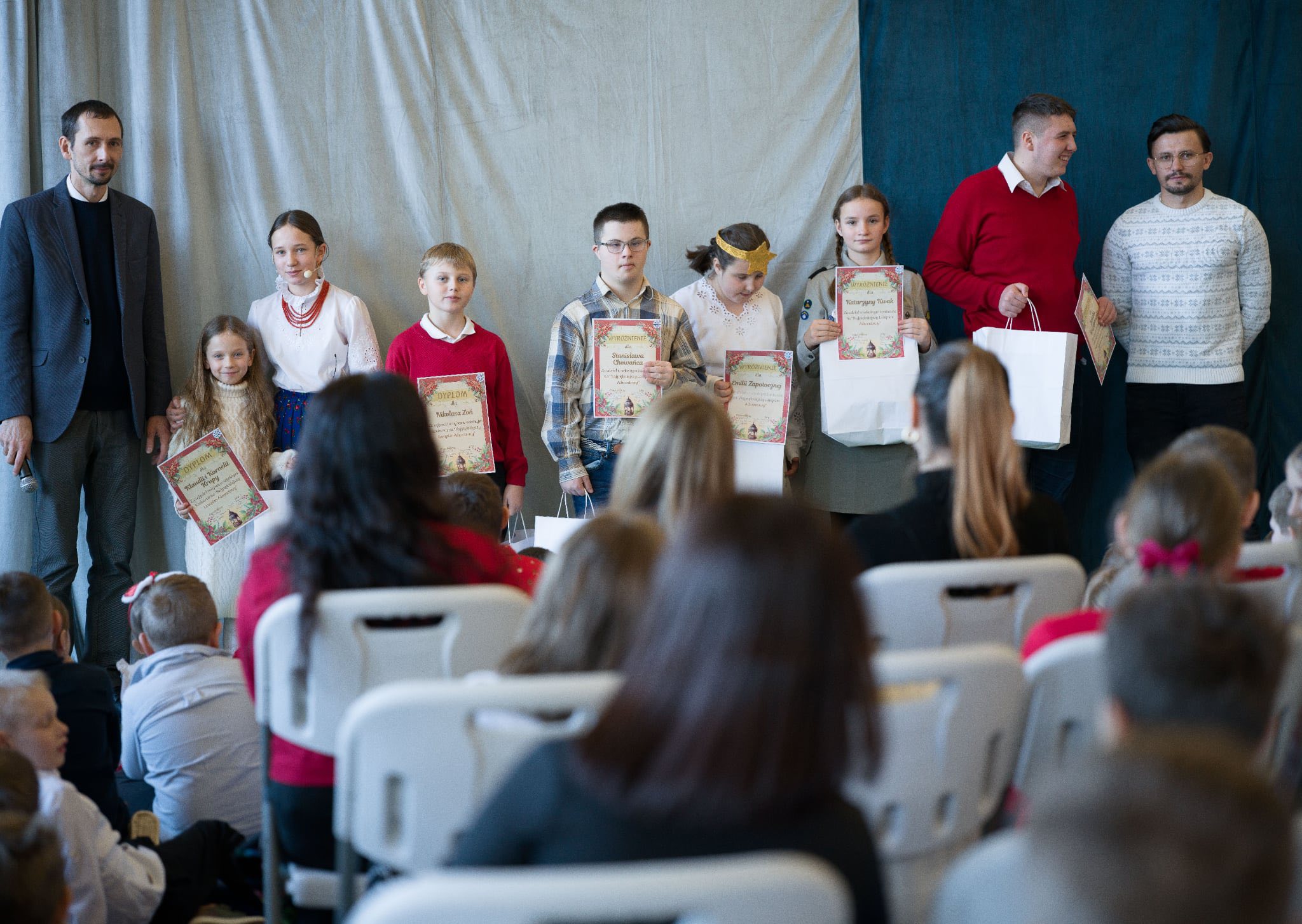 W dalszej części spotkania odbyło się wręczenie nagród uczniom, którzy z wielkim zaangażowaniem wzięli udział w szkolnych konkursach. Nagrodzono laureatów konkursu poświęconego postaci bł. Carlo Acutisa, konkursu recytatorów i gawędziarzy im. Skupnia Florka, konkursu na najpiękniejszy lampion adwentowy, a także konkursu na kartkę bożonarodzeniową w języku angielskim, które zostaną przekazane do Domu Dziecka w Wielkiej Brytanii. Był to piękny gest otwartości serc, wrażliwości i dzielenia się świąteczną radością z innymi – nawet ponad granicami.