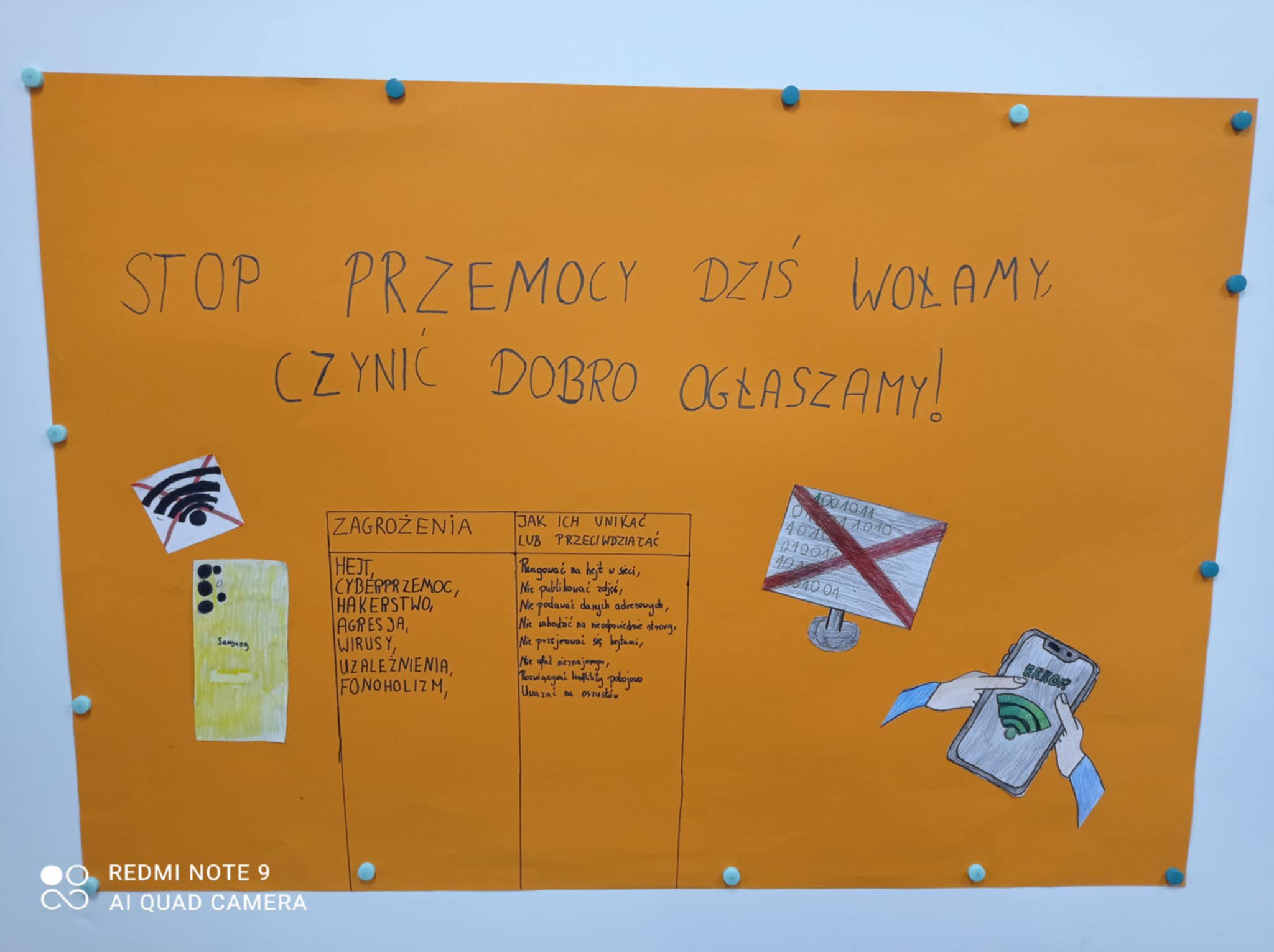 Na stronie internetowej i profilu FB szkoły pojawiały się plakaty i materiały edukacyjne związane z cyberzagrożeniami, hejtem i przemocą.