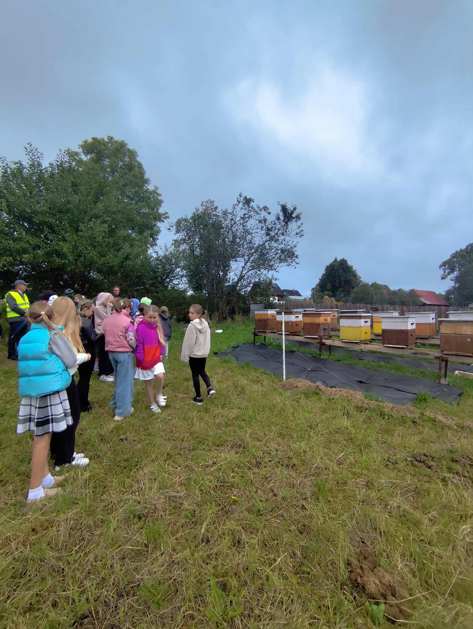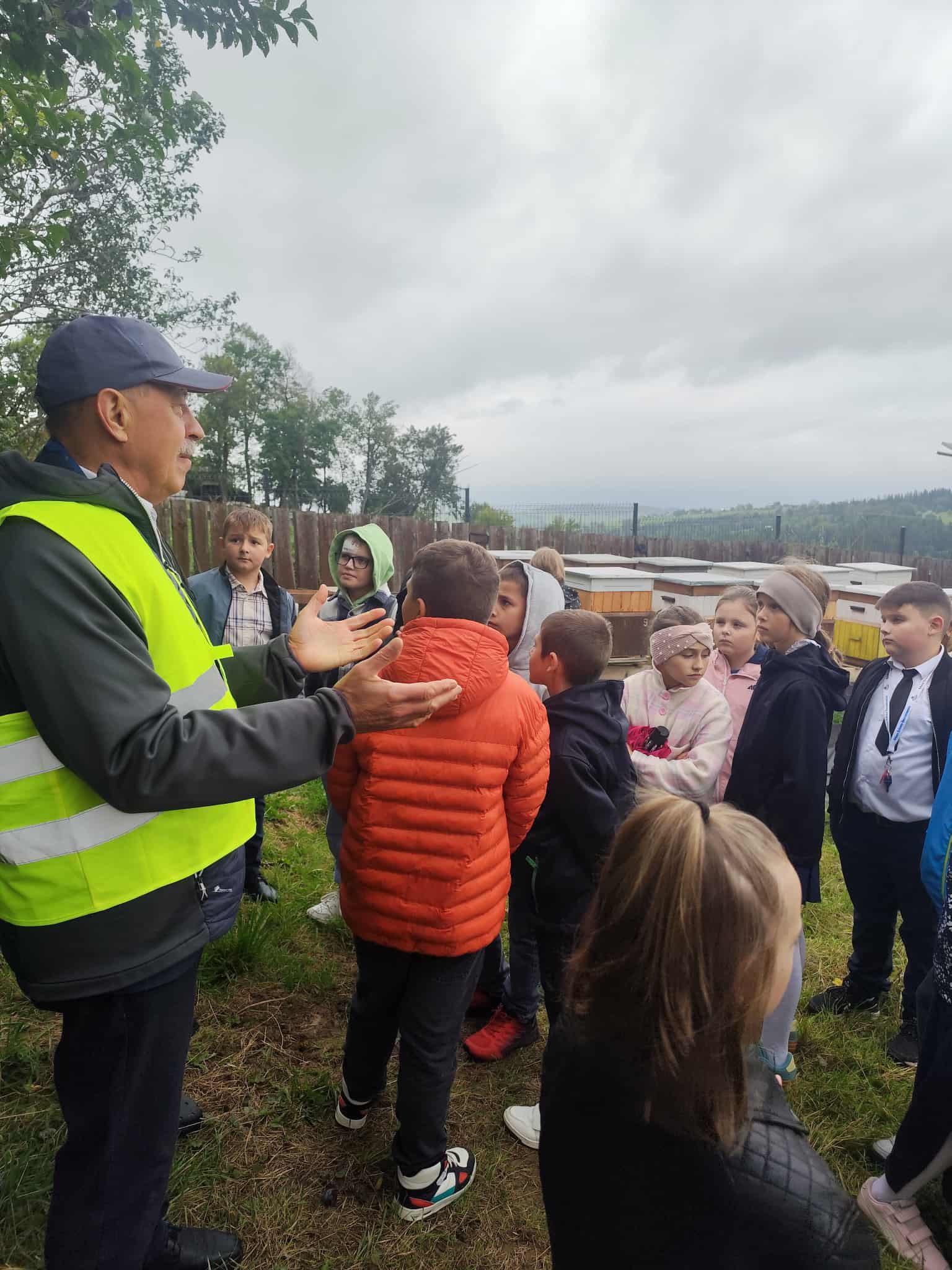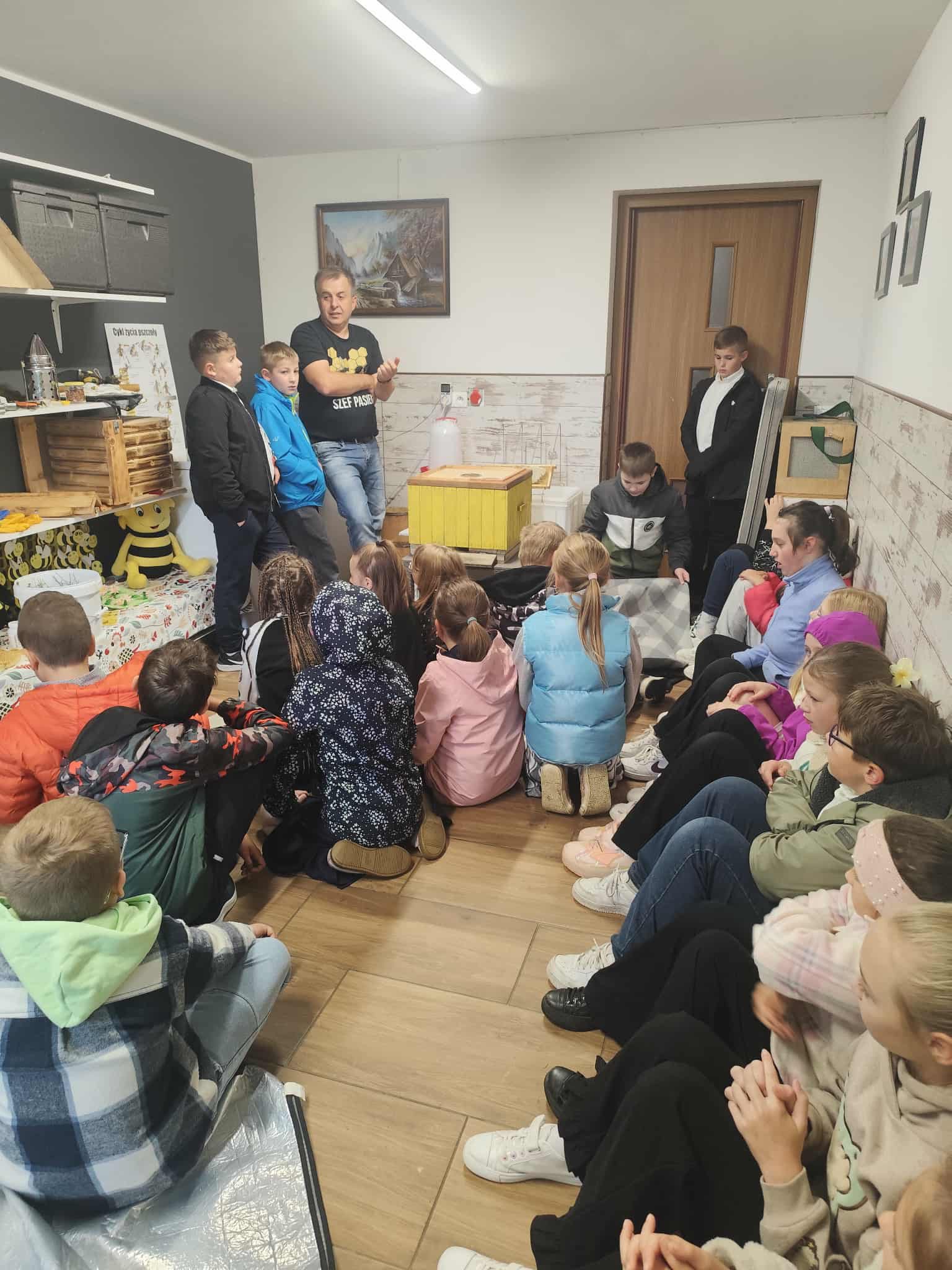 Uczniowie klas czwartych wybrali się na wycieczkę do lokalnego pszczelarza Pana Pawła Zaryckiego, aby poznać tajemnice życia pszczół. Podczas spotkania uczniowie dowiedzieli się wielu ciekawostek na temat pracy tych niezwykle pożytecznych owadów – jak powstaje miód, dlaczego pszczoły są tak ważne dla przyrody oraz jakie zadania pełnią w ulu. Pszczelarz opowiedział również o swojej codziennej pracy, pokazując narzędzia, których używa na pasiece. Największą atrakcją była możliwość zobaczenia z bliska prawdziwych uli oraz pszczół w naturalnym środowisku. Wycieczka była nie tylko interesującą lekcją , ale także inspiracją do dbania o środowisko i szacunku dla pracy pszczół.