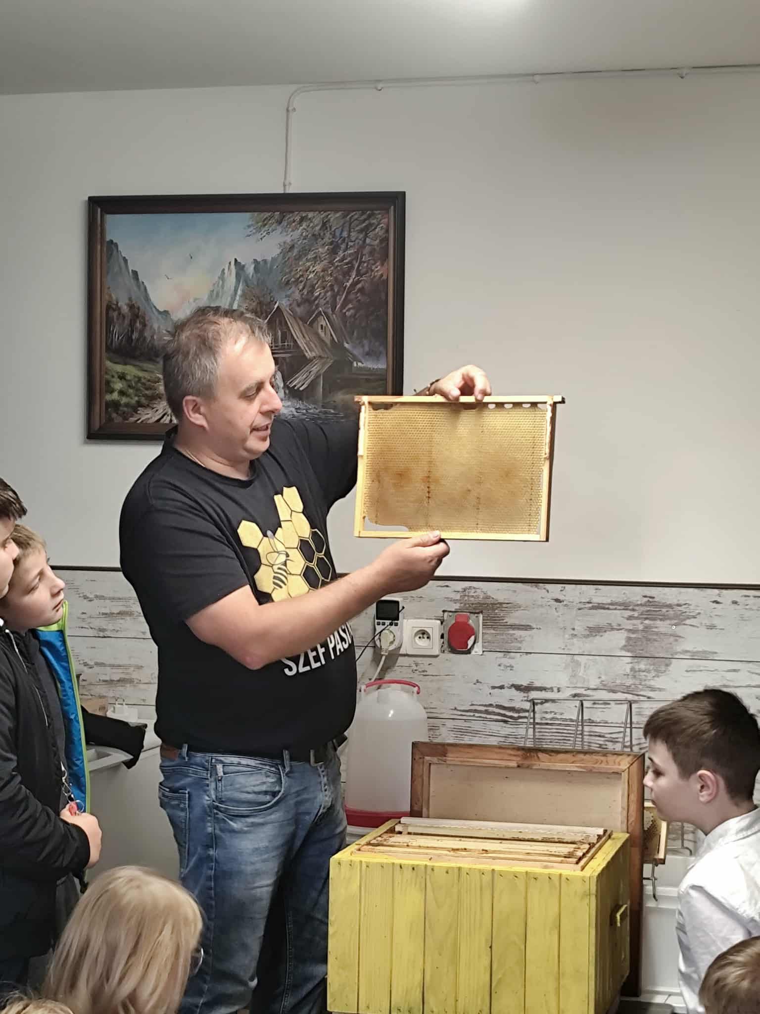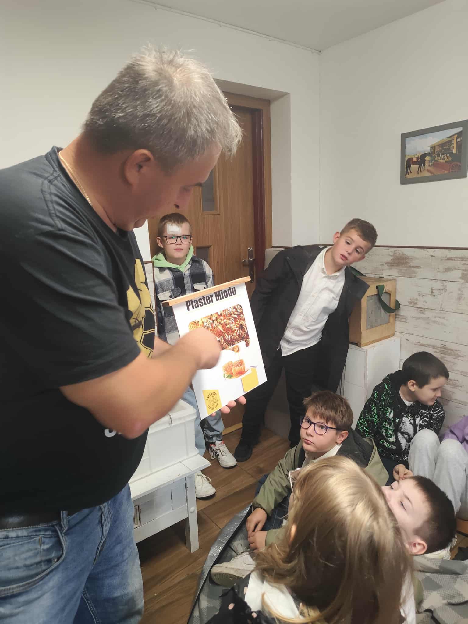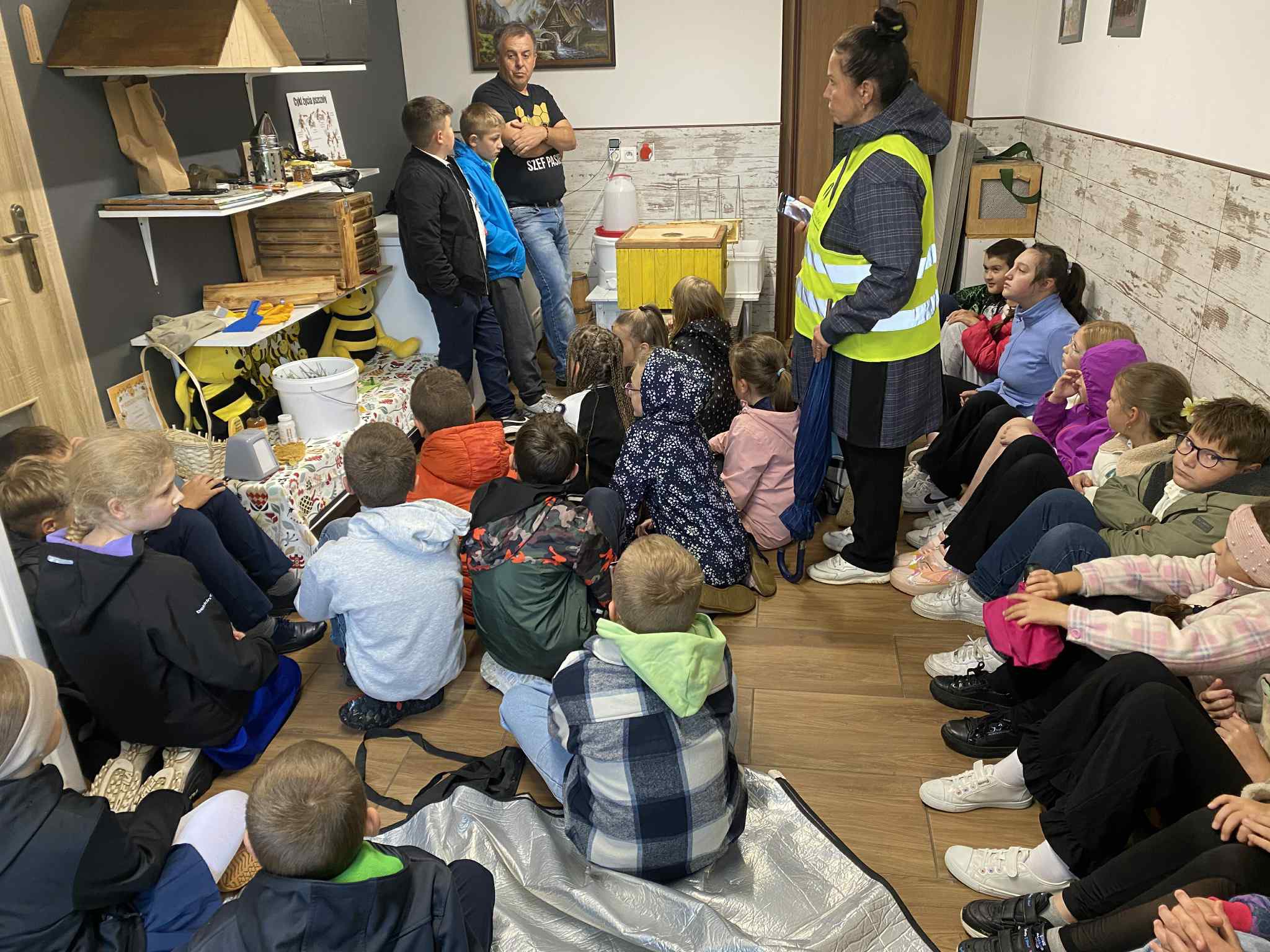 Uczniowie klas czwartych wybrali się na wycieczkę do lokalnego pszczelarza Pana Pawła Zaryckiego, aby poznać tajemnice życia pszczół. Podczas spotkania uczniowie dowiedzieli się wielu ciekawostek na temat pracy tych niezwykle pożytecznych owadów – jak powstaje miód, dlaczego pszczoły są tak ważne dla przyrody oraz jakie zadania pełnią w ulu. Pszczelarz opowiedział również o swojej codziennej pracy, pokazując narzędzia, których używa na pasiece. Największą atrakcją była możliwość zobaczenia z bliska prawdziwych uli oraz pszczół w naturalnym środowisku. Wycieczka była nie tylko interesującą lekcją , ale także inspiracją do dbania o środowisko i szacunku dla pracy pszczół.